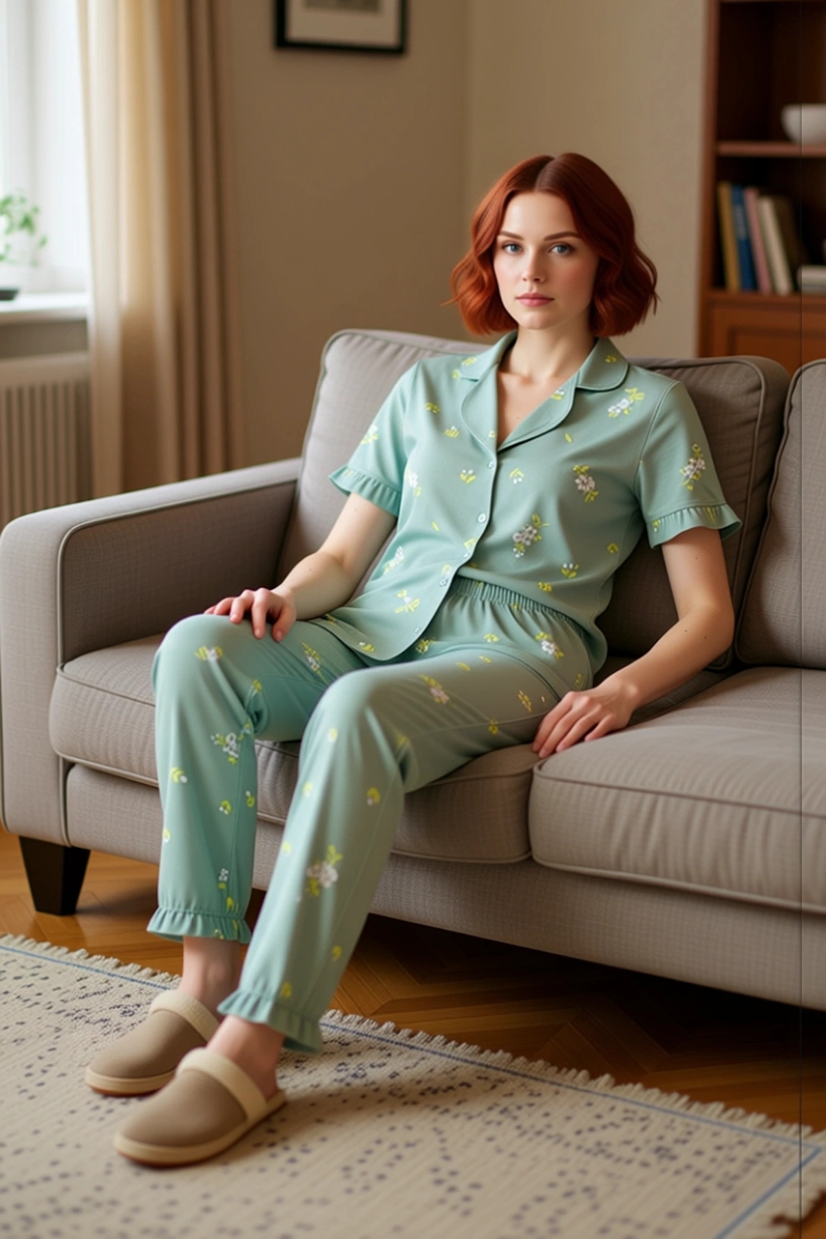 Kadın Mint Çiçekli Fırfırlı Ev Giyim Takımı Fonksiyonel Dayanıklı Kaliteli Konforlu Modern