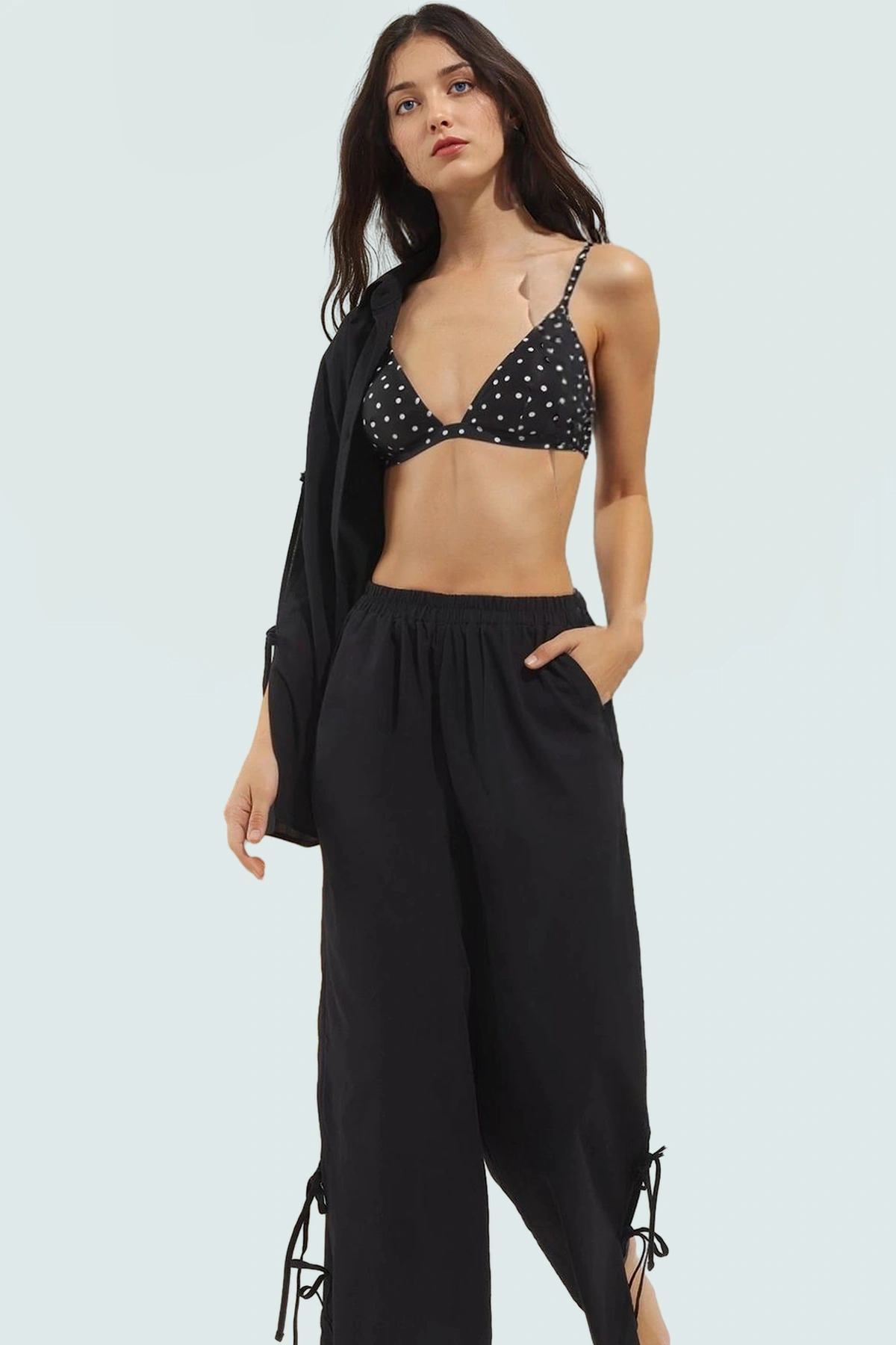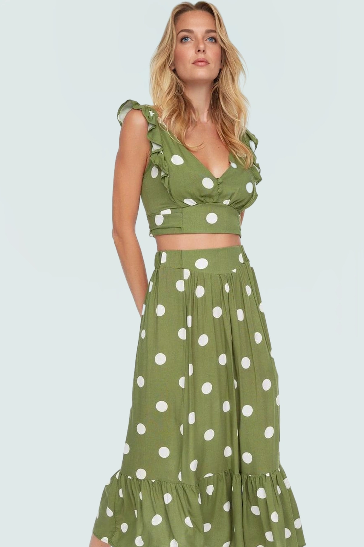 Rahat Puantiyeli Viskoz Bluz Etek Takım Plaj ve Günlük Kullanım Dayanıklı Malzeme Trend Tasarım