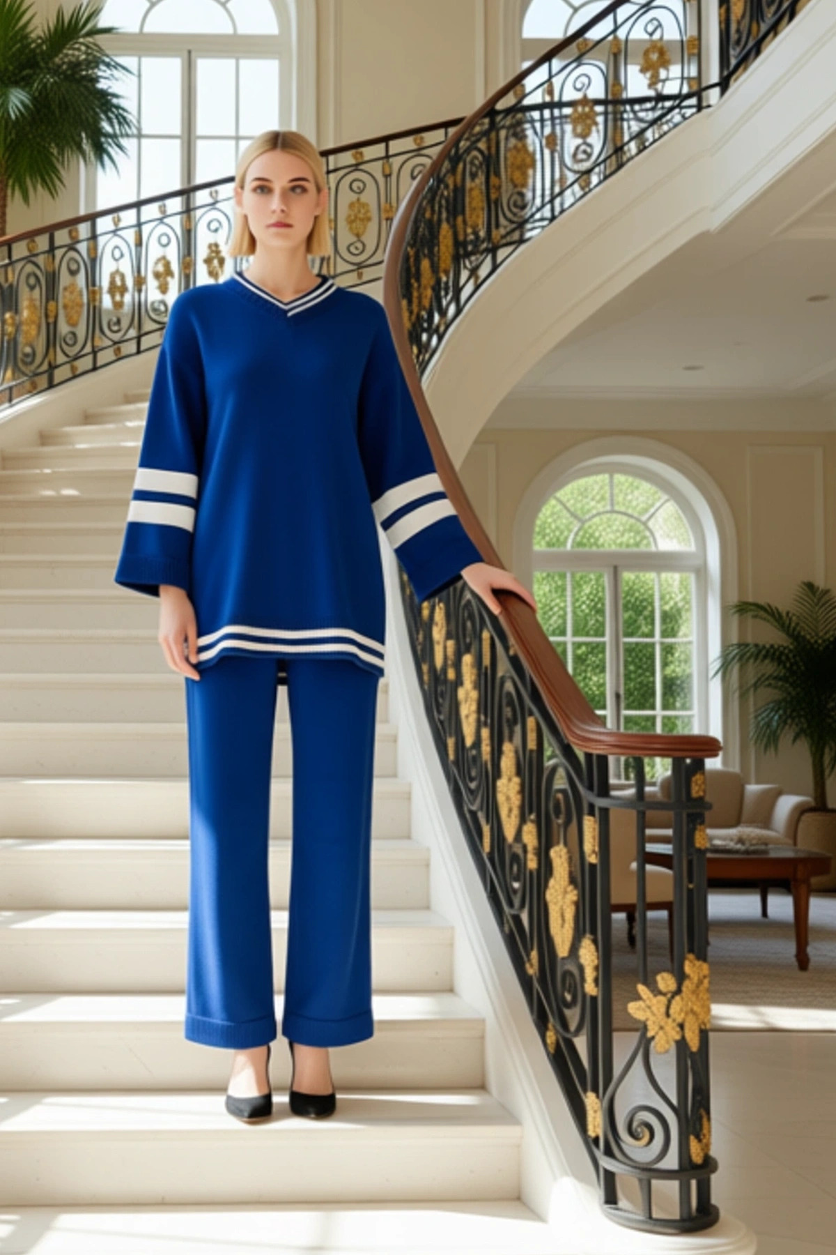 Moda Renk Bloklu Düşük Kol Casual Günlük Indigo Renk Bloklu Çizgili Triko Alt-Üst Takım