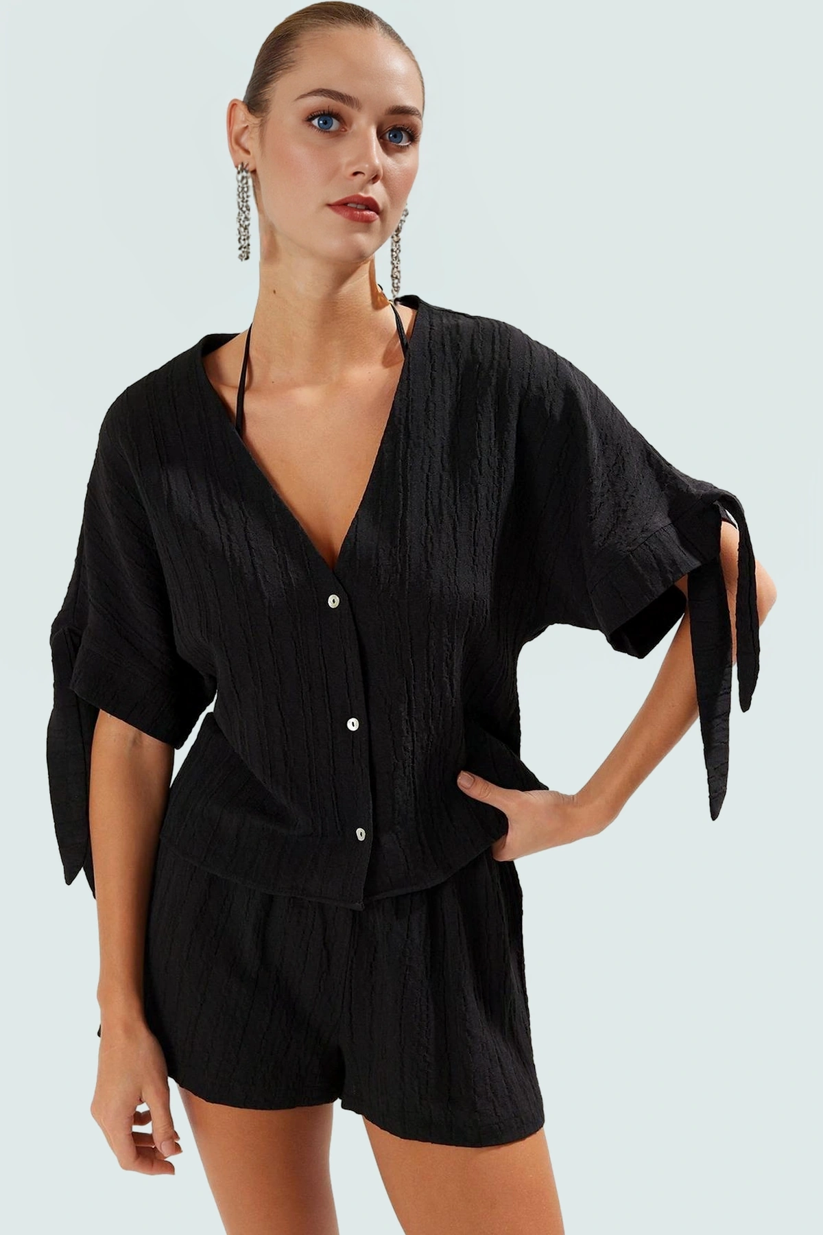 V Yaka Bağlamalı Kol Bluz Şort Takım Keten Karışımlı Dokuma Rahat Ve Şık Zarifane Tasarım