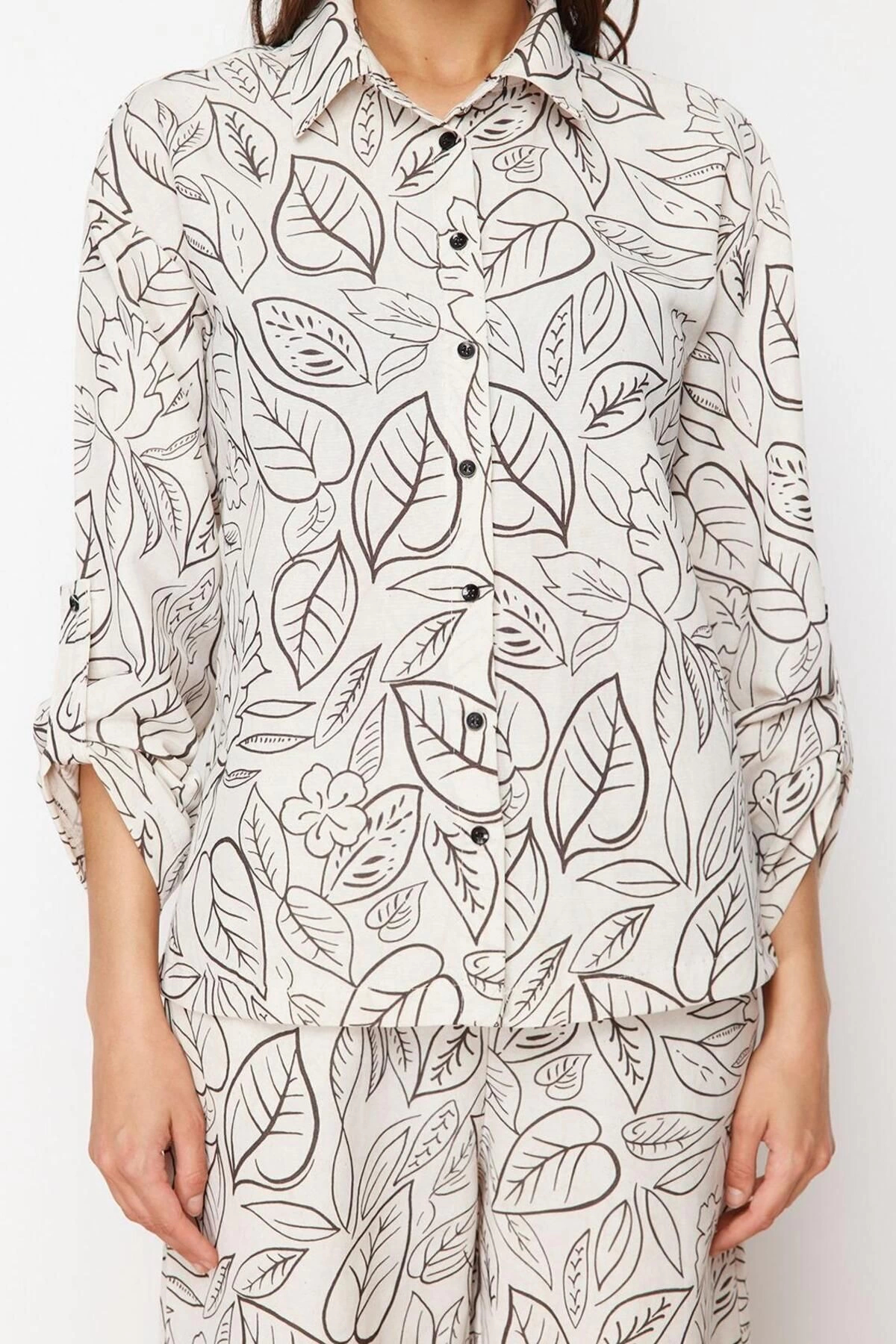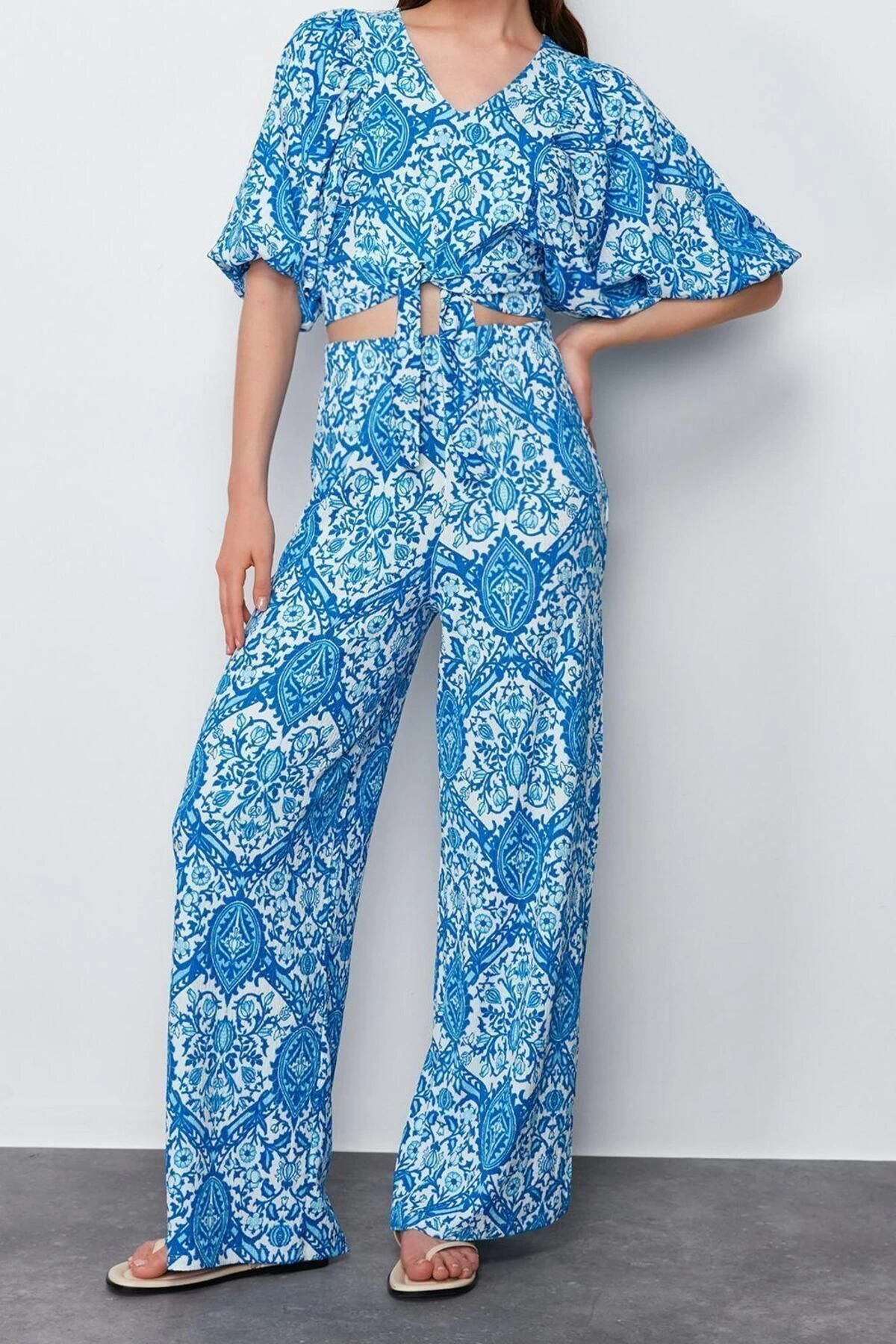 Pamuklu Dokuma Çiçekli Bluz Pantolon Takımı Yazlık Plaj Modası Reglan Kol Seçkin Malzeme