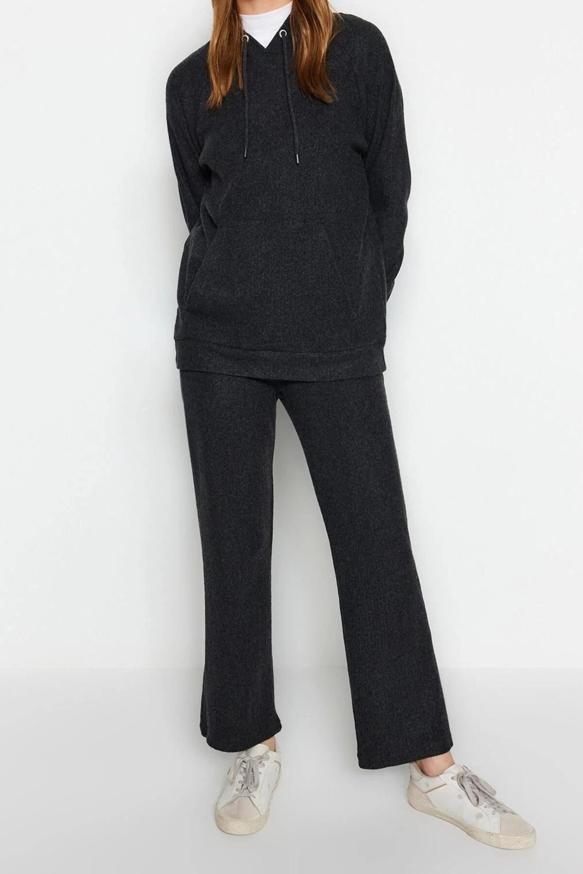 Moda Yüksek Bel Bisiklet Yaka Sportswear Kapüşonlu Kaşkorse Sweatshirt-Pantolon Örme Alt-Üst Takım