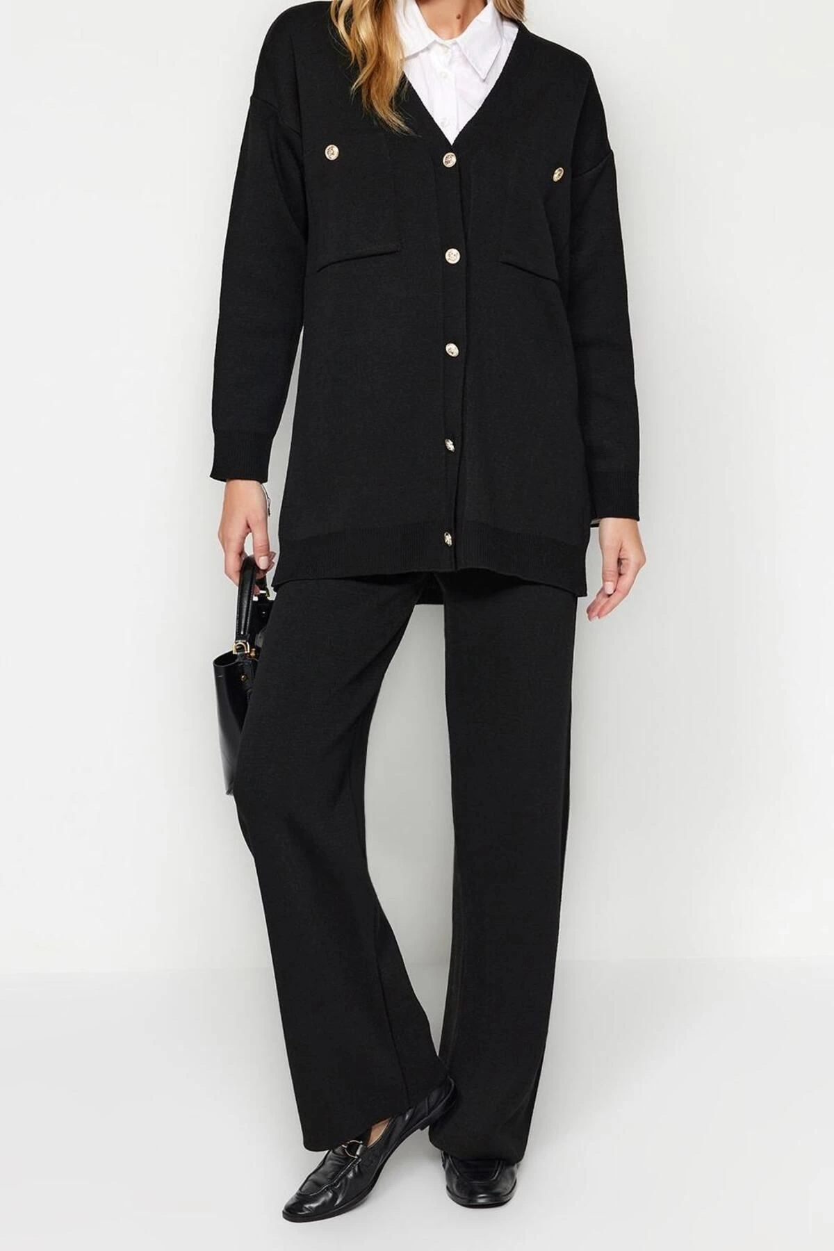 Moda Düz V Yaka Düşük Kol Casual Günlük Siyah Düğmeli Hırka-Pantolon Triko Alt-Üst Takım