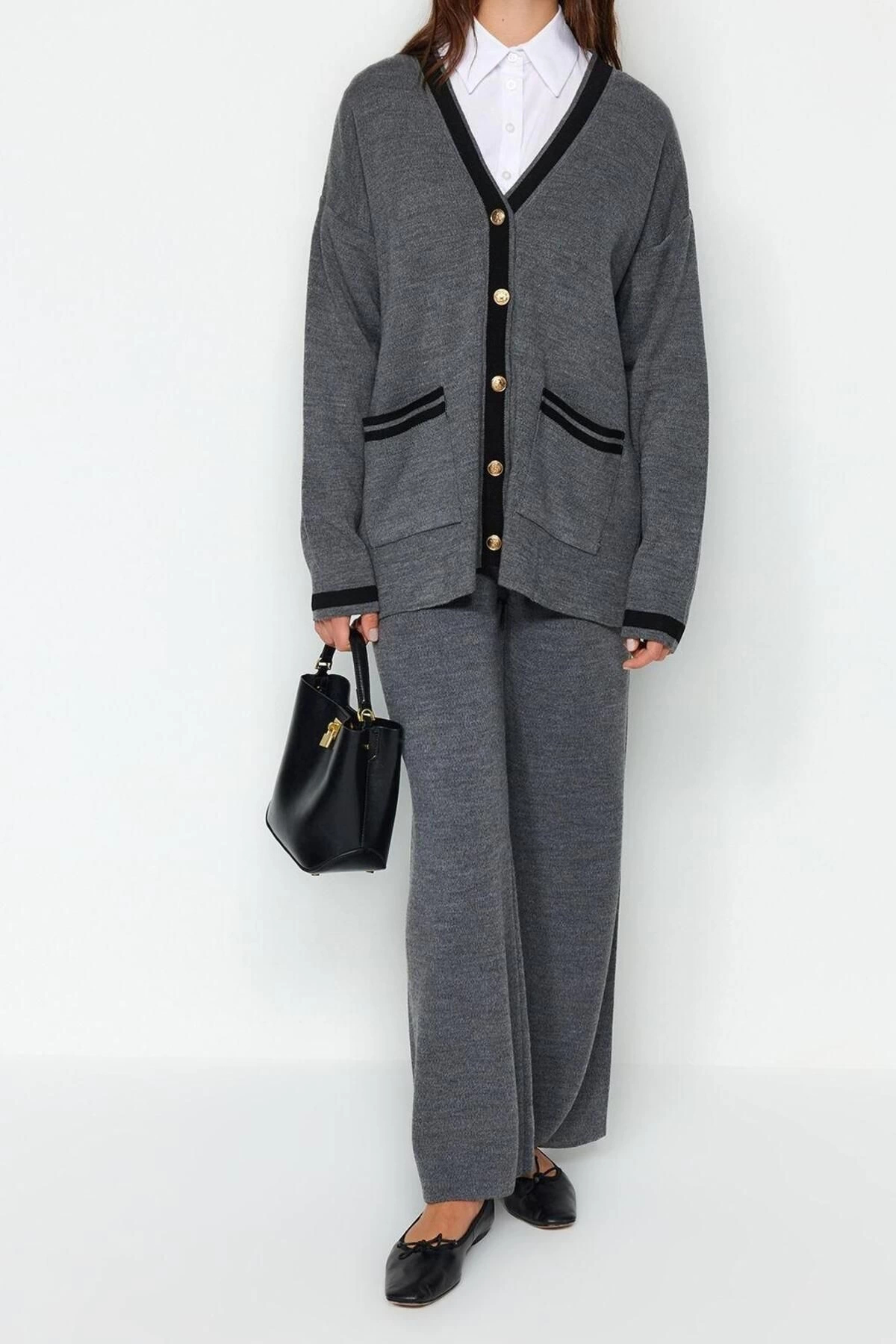 Moda Renk Bloklu V Yaka Düşük Kol Renk Bloklu Gold Düğmeli Cepli Hırka-Pantolon Triko Alt-Üst Takım