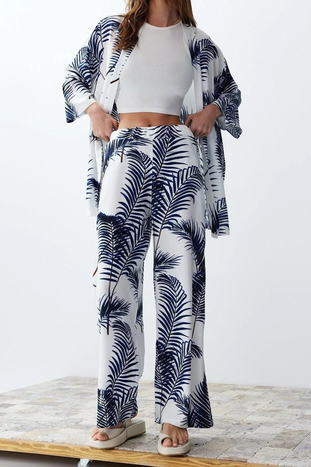 Moda Dokuma Baskılı Degaje Yaka Casual Günlük Siyah Desenli Kimono Pantolon Dokuma Alt-Üst Takım