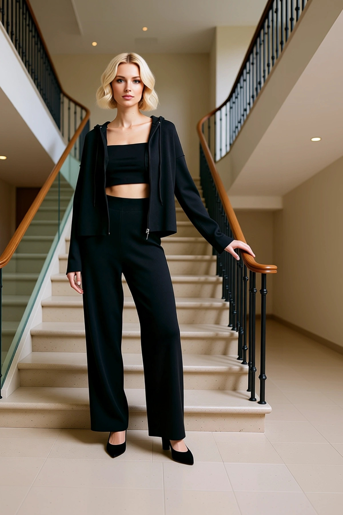Tarz Kadın Yüksek Bel Geniş Paça Havuz Yaka Yumoş Crop ve Wide Leg Geniş Paça Örme Alt Üst Takım