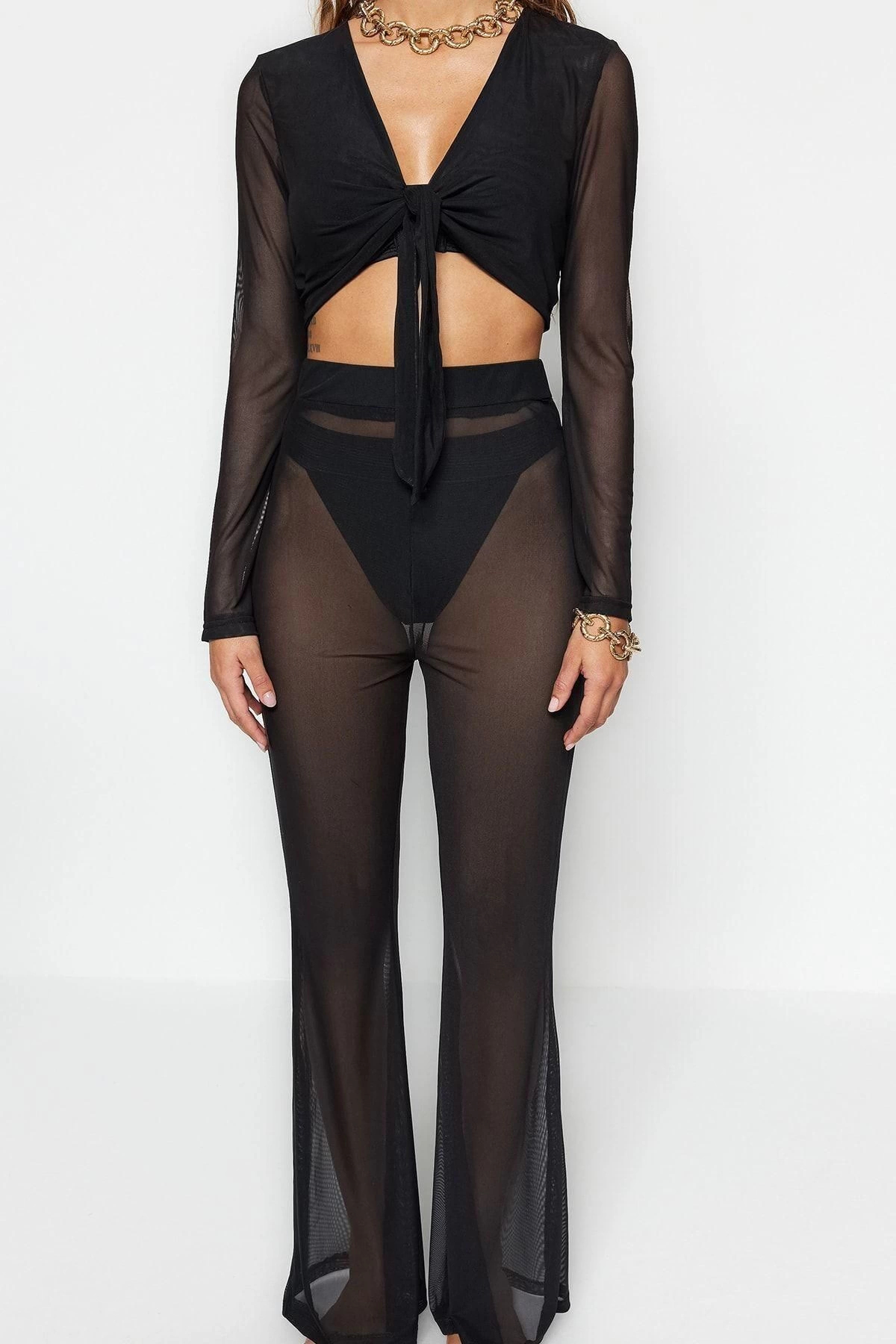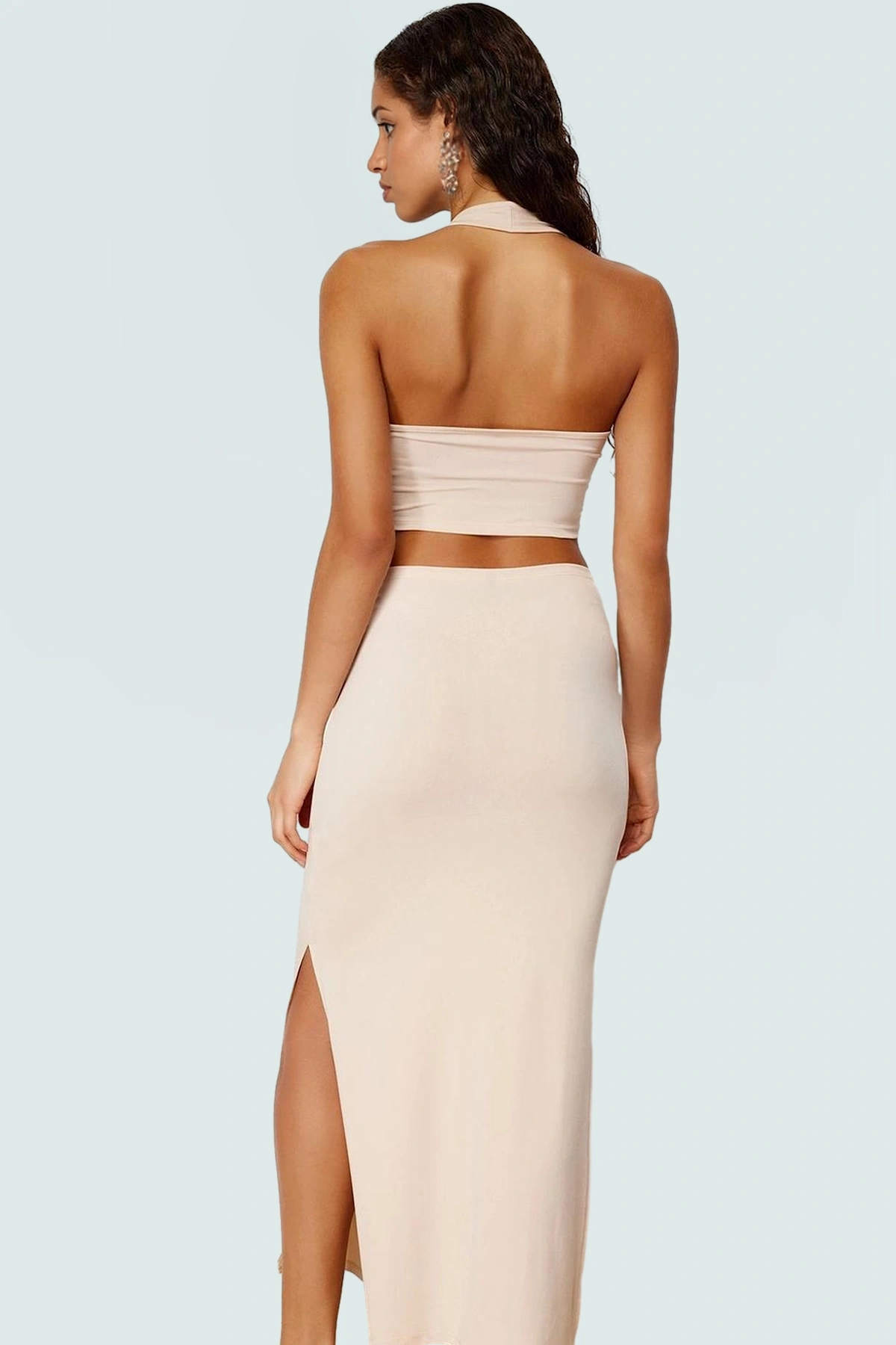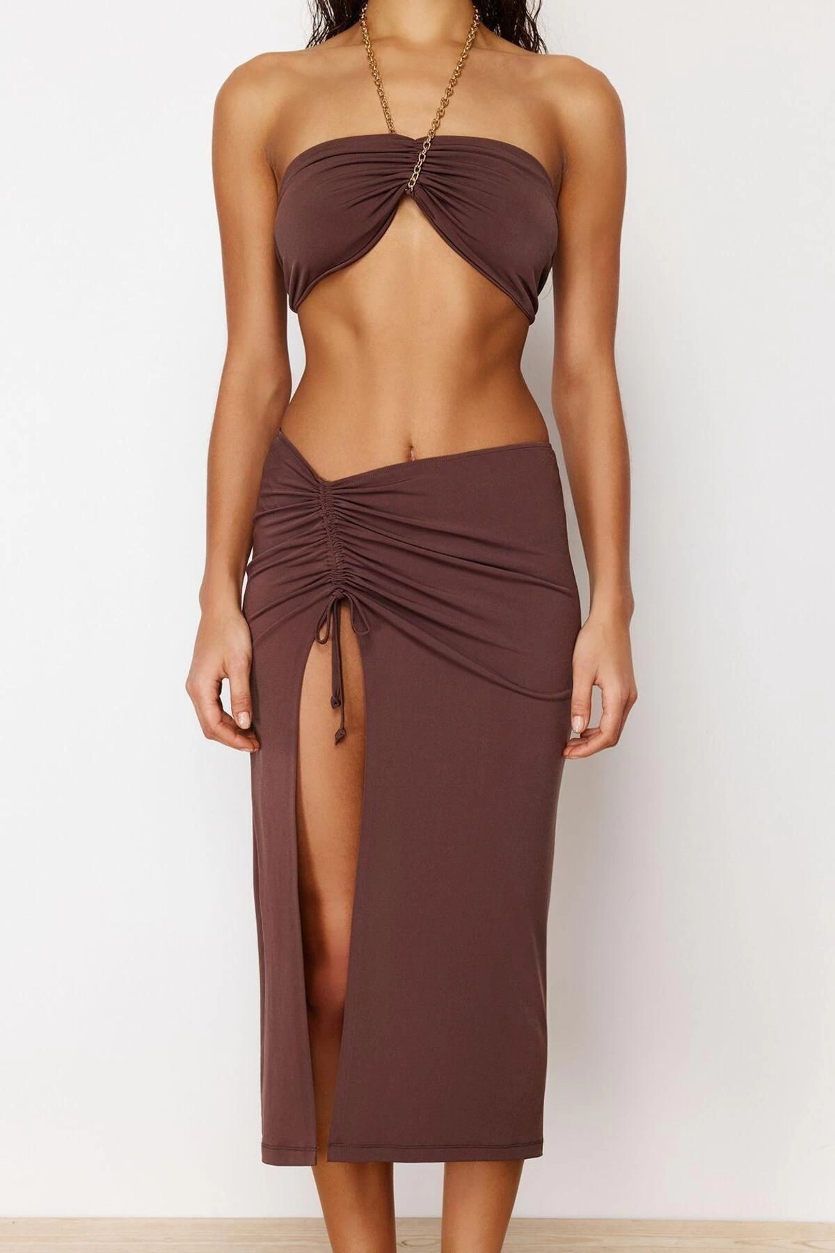 Şık Plaj Takımı Straplez Bluz Etek Zincir Detay Örme Kumaş Konforlu Kesim Zarifane Tasarım