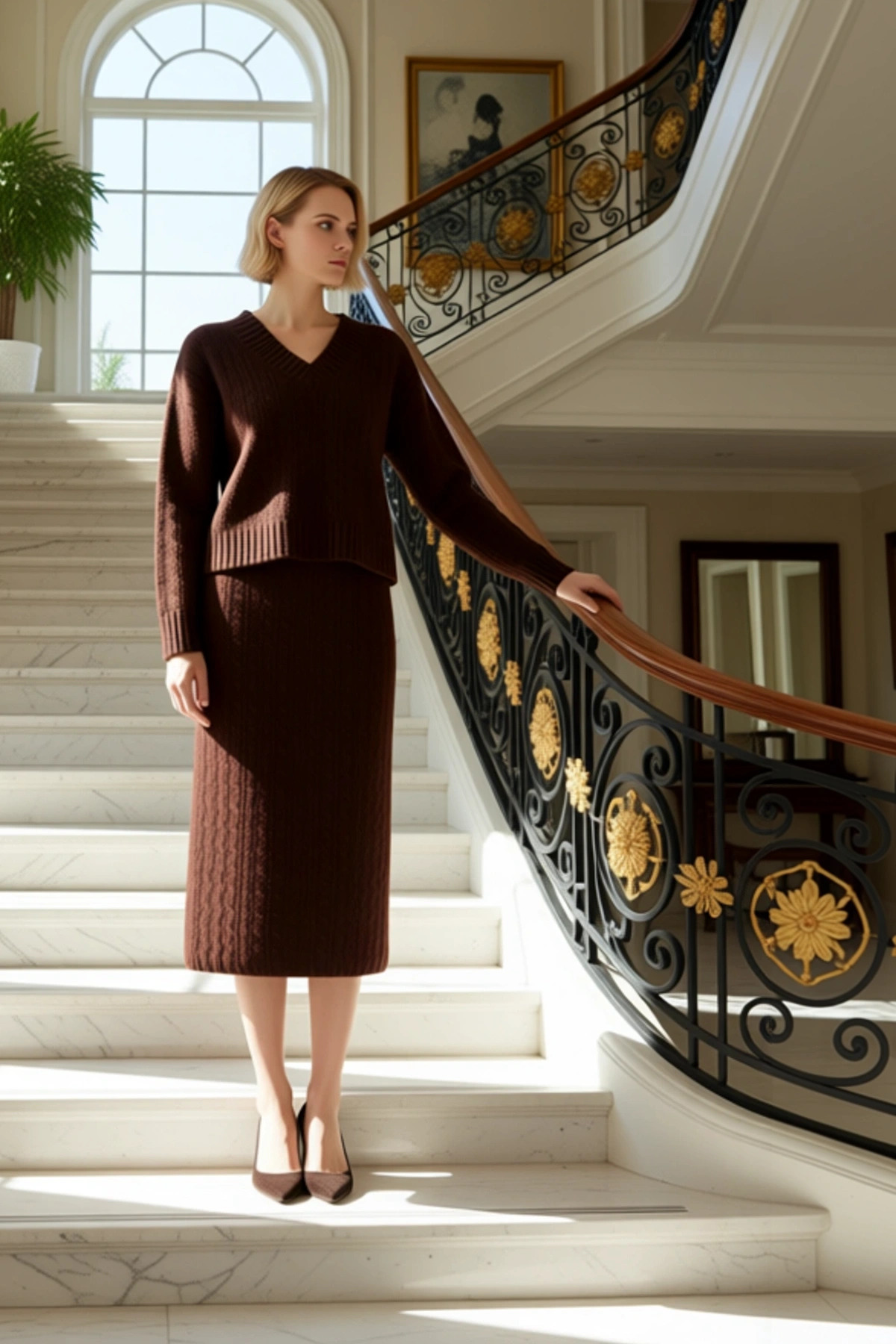 Tarz Kadın Modern Moda Normal Bel Boru Paça Ceket Yaka Etek-Bluz-Hırka Üçlü Triko Alt-Üst Takım