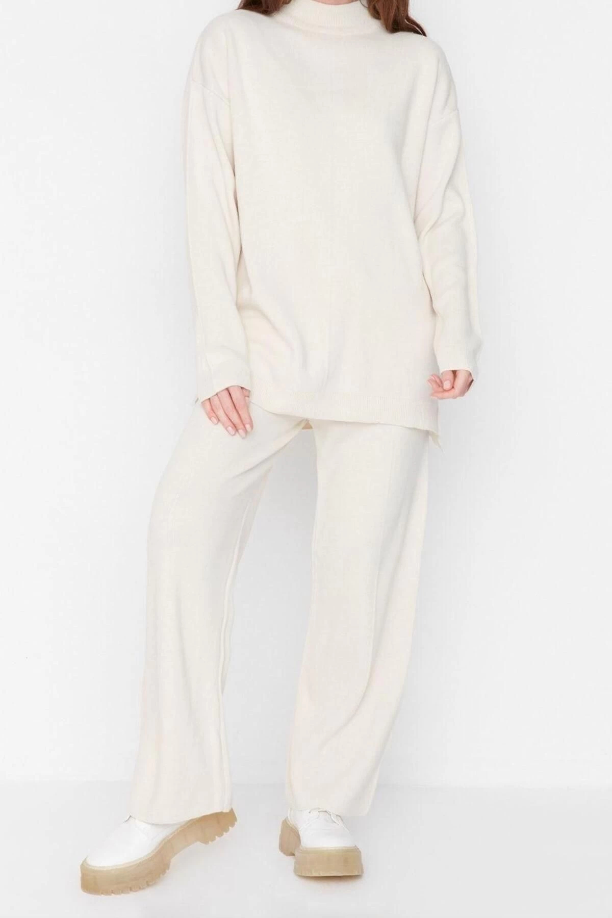 Tarz Kadın Modern Moda Normal Bel Boru Paça Bisiklet Yaka Yırtmaç Detaylı Triko Alt-Üst Takım