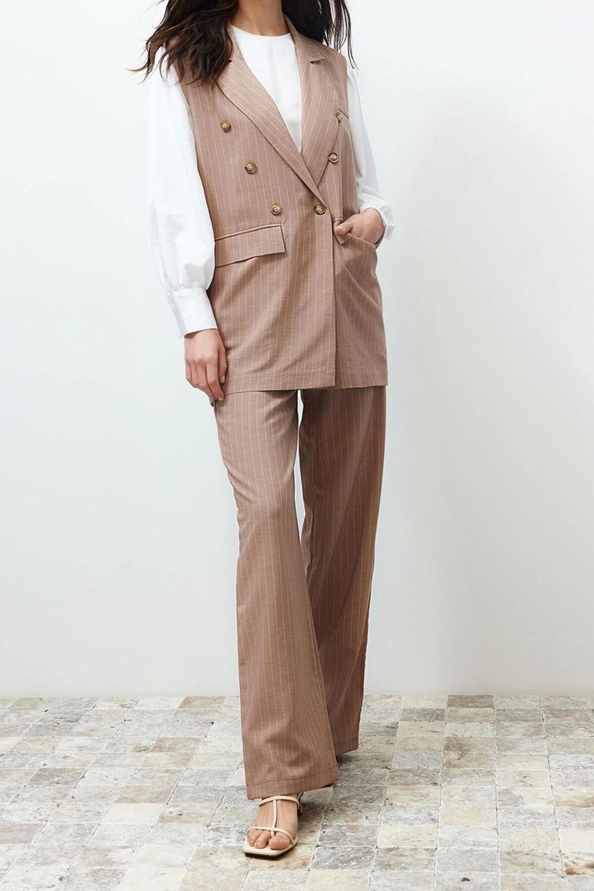 Tarz Kadın Modern Moda Normal Bel Boru Paça Polo Yaka Fitilli Örgü Polo Yaka Triko Alt-Üst Takım