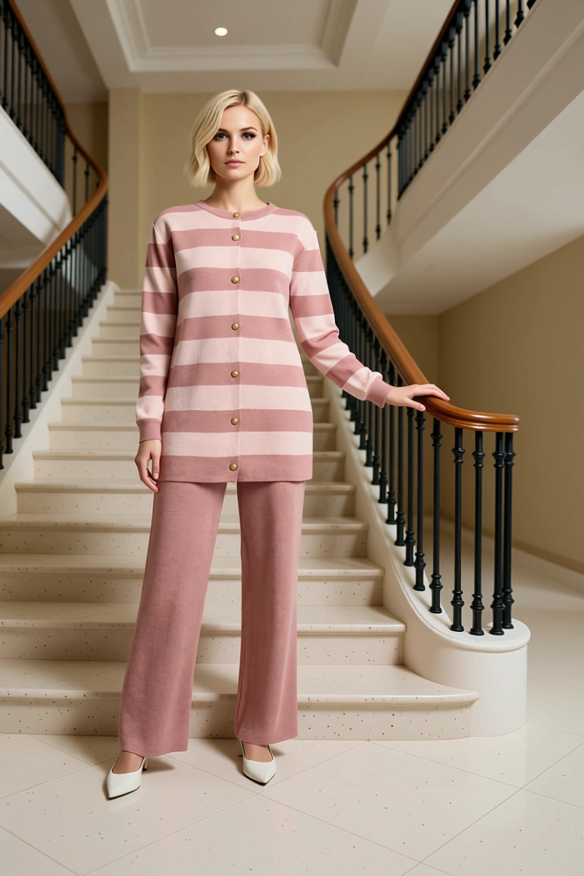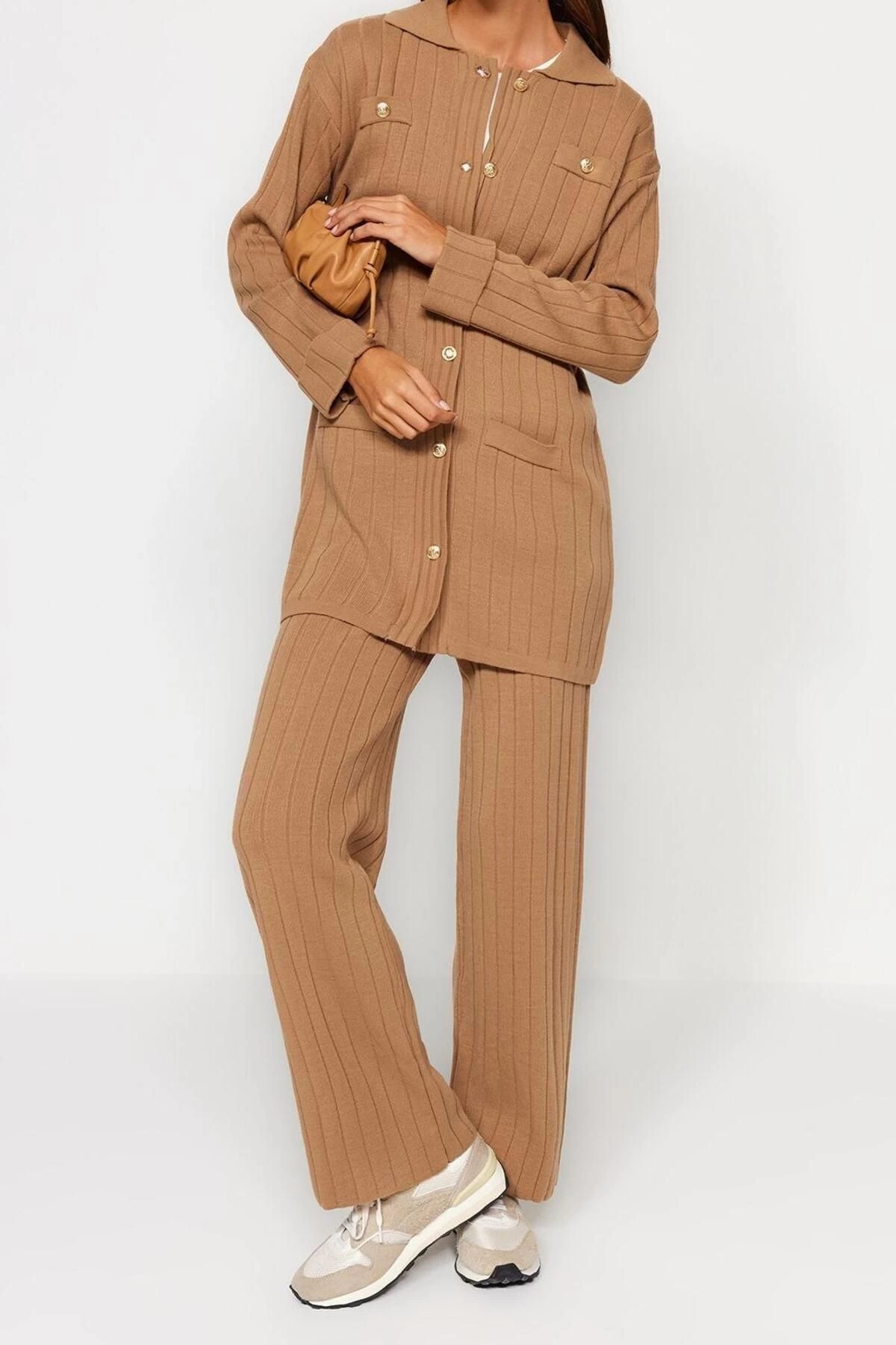 Tarz Kadın Normal Bel Boru Paça Gömlek Yaka Gold Düğme Detaylı Dalgıç Scuba Örme Alt-Üst Takım