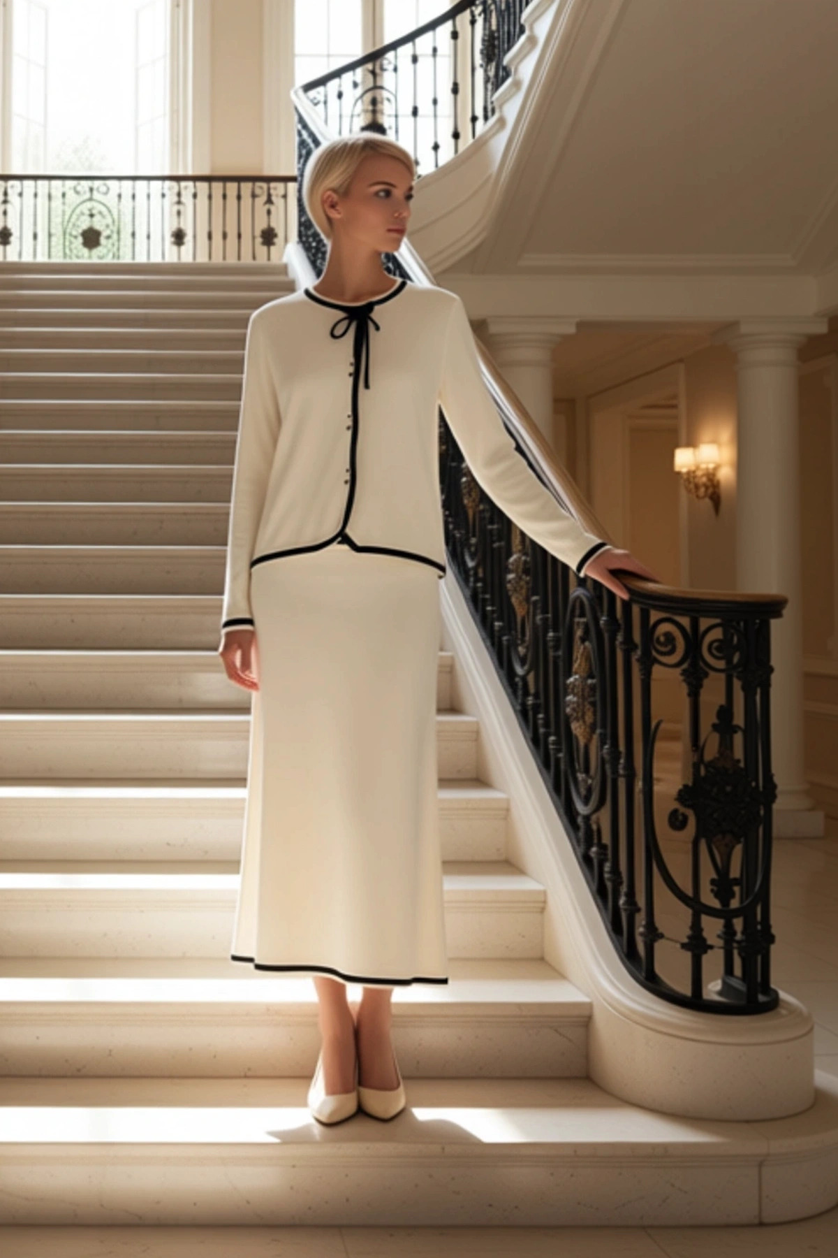 Tarz Kadın Modern Normal Bel Boru Paça Biyeli Aksesuar Düğmeli Triko Hırka Etek Alt-Üst Takım