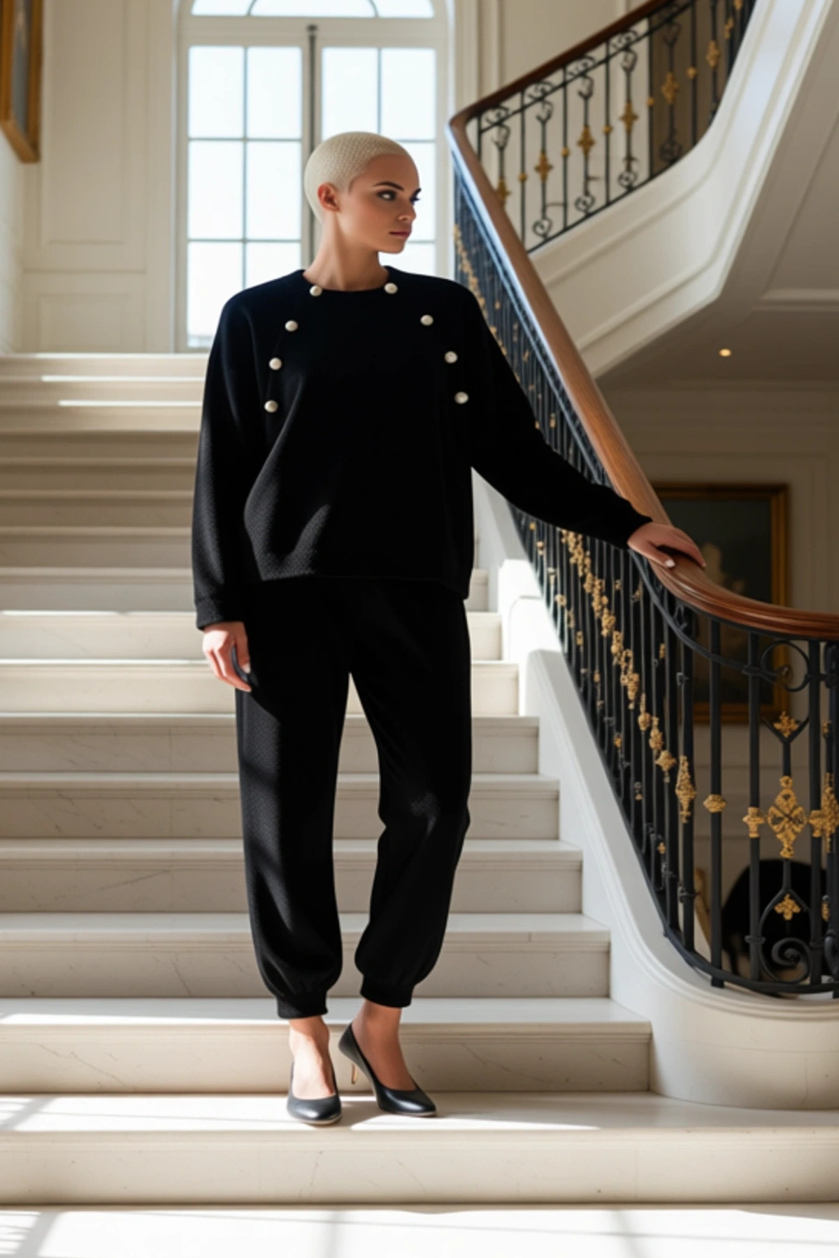 Tarz Kadın Modern Moda Normal Bel Boru Paça V Yaka Siyah Biyeli Yaka Detaylı Triko Alt-Üst Takım