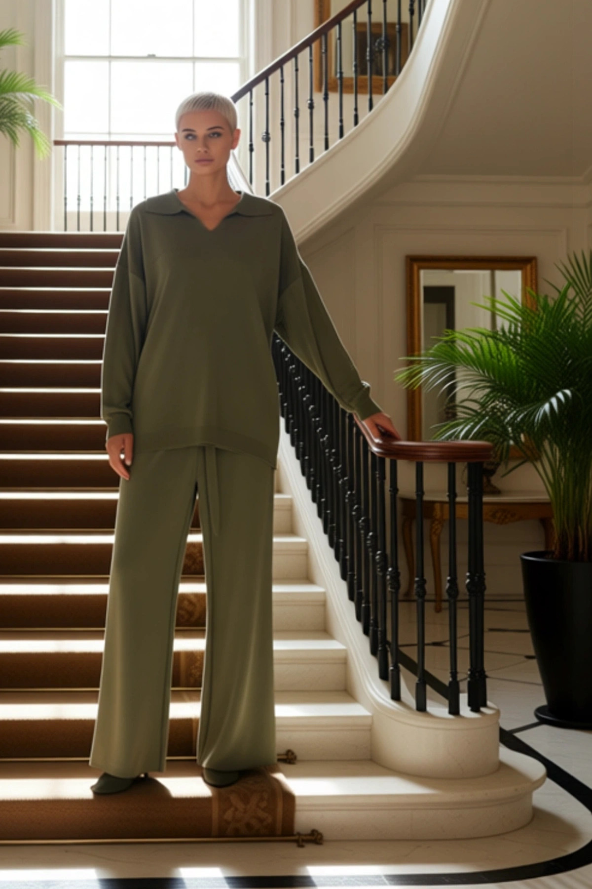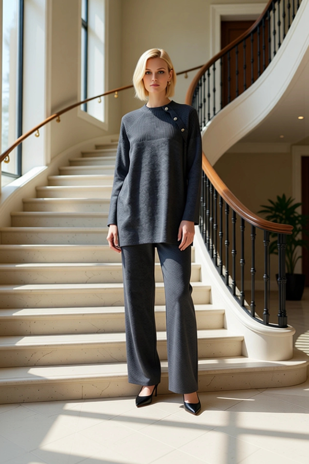Tarz Kadın Modern Moda Normal Bel Boru Paça Dik Yaka Düğme Detaylı Triko Alt-Üst Takım