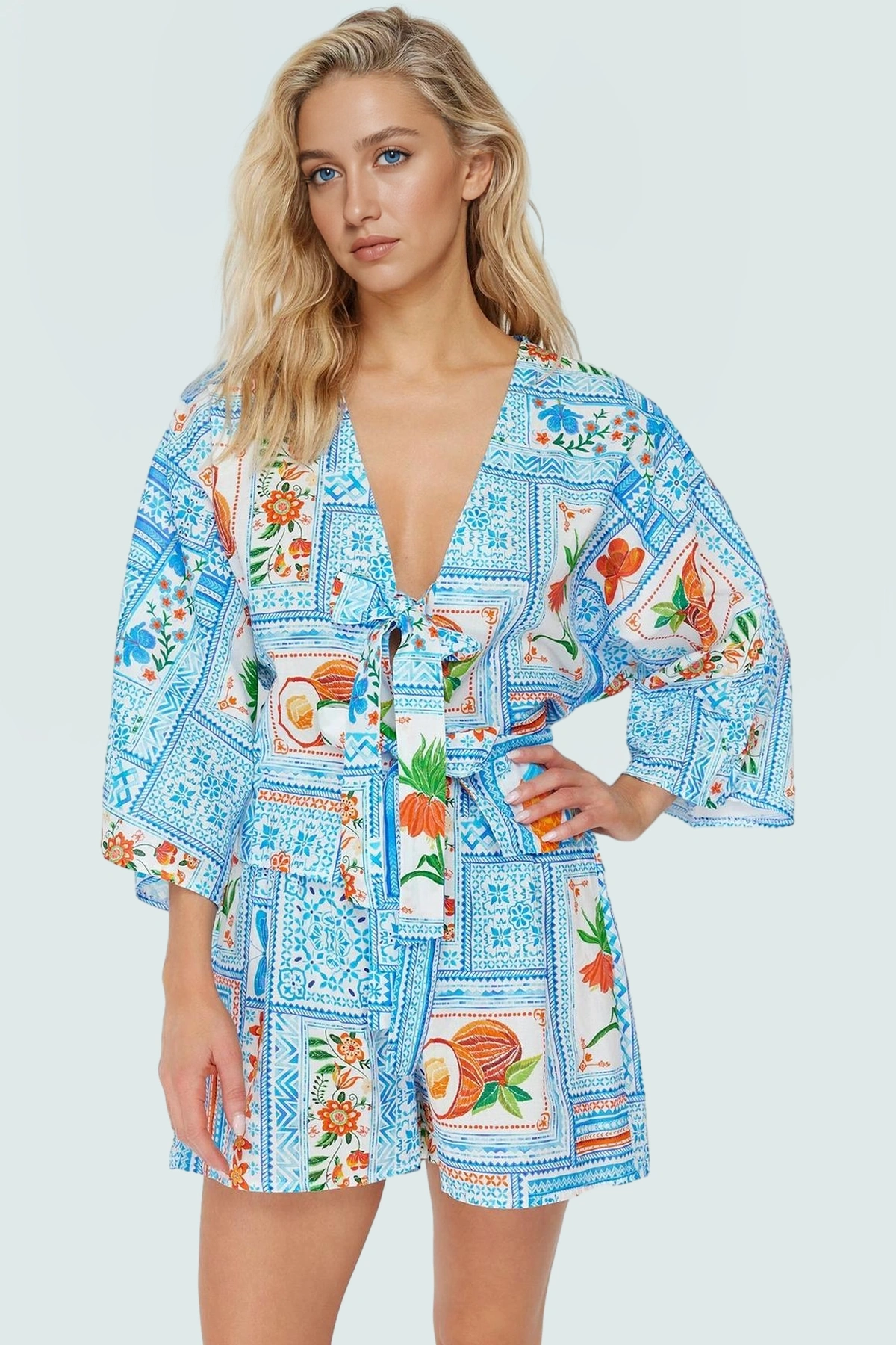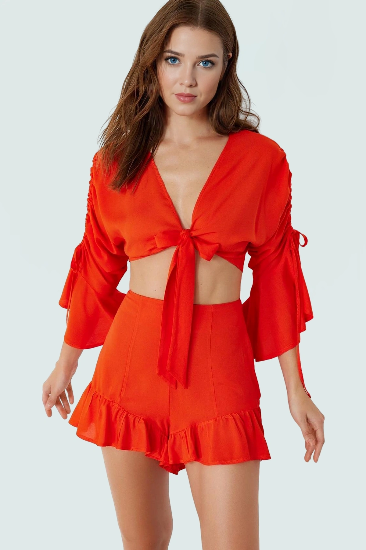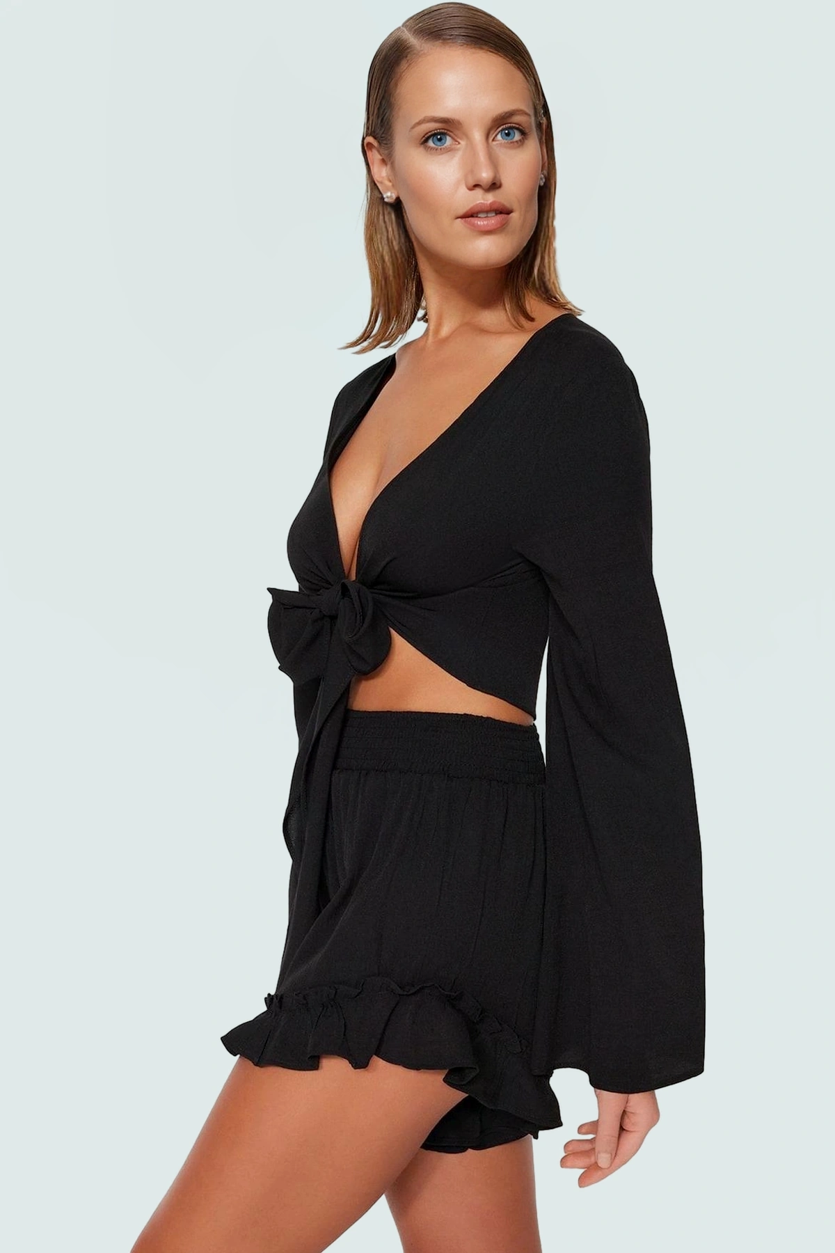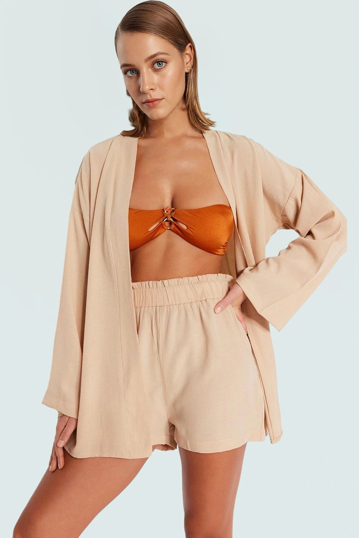 Rahat Yazlık Şortlu Kimono Takım Dokuma V Yaka Plaj Modası Mükemmel Uyum Trend Tasarım