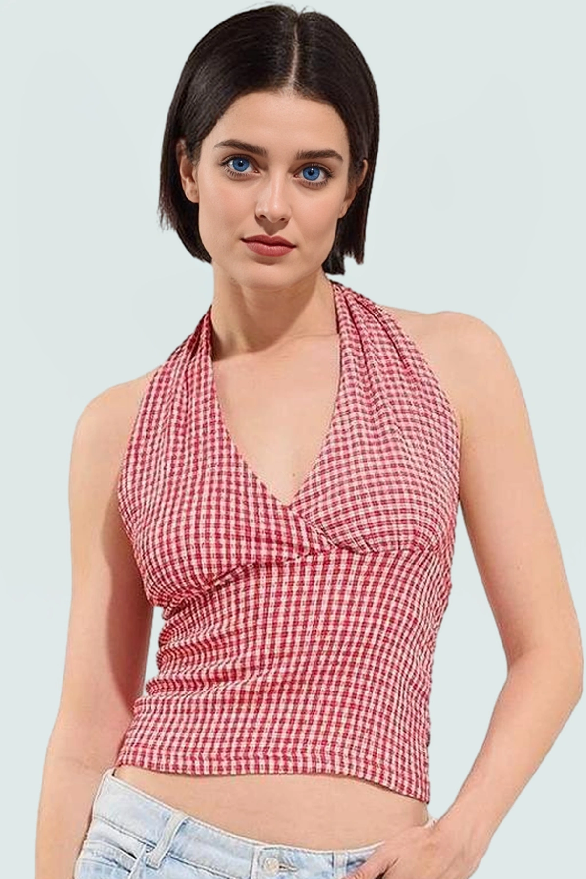 Denim Crop Bluz Halter Yaka Fitted 100 Pamuk Yazlık Dayanıklı Malzeme Yüksek Kalite