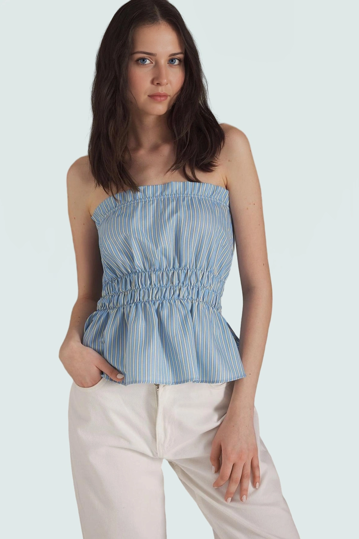 Asimetrik Yaka Çizgili Bluz Fitted Kalıp Dokuma Kumaş Yazlık ve Günlük Kullanım İçin