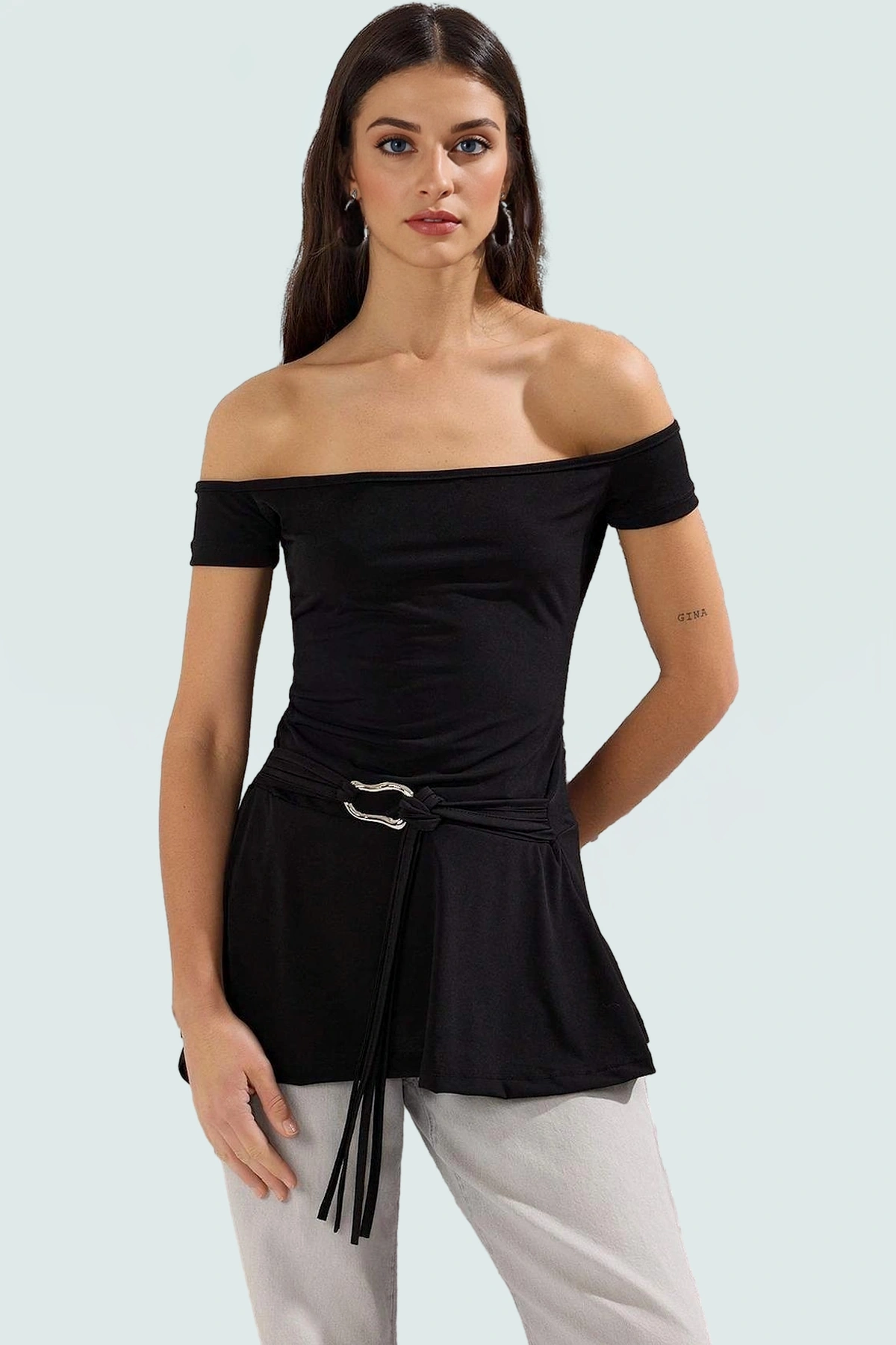 Uzun Örme Bluz Carmen Yaka Kemerli Rahat Kalıp Yazlık Yüksek Kalite Şık Görünüm
