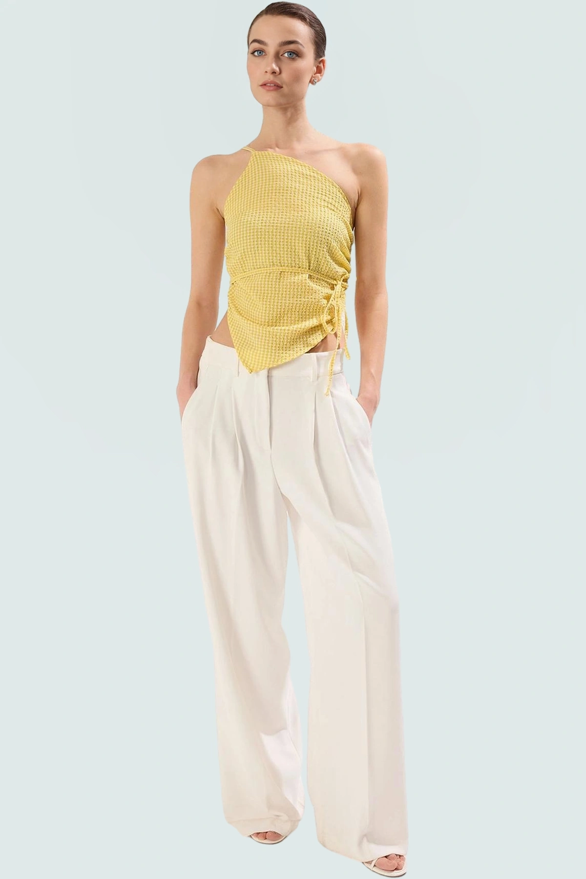 Fitted Örme Bluz Boyundan Bağlamalı Kareli Yazlık Rahat Trend Tasarım Mükemmel Uyum