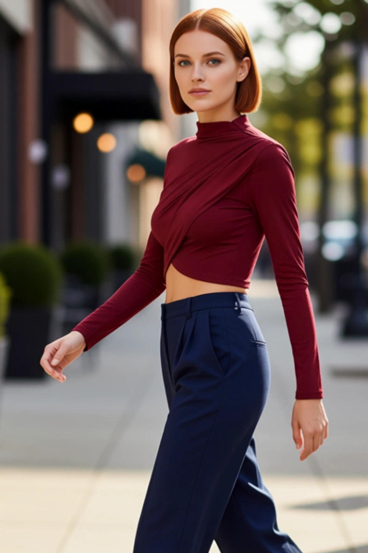Moda Dik Yaka Örme Slim Düz Desen Şık gece Crop Uzun Kol Bluz
