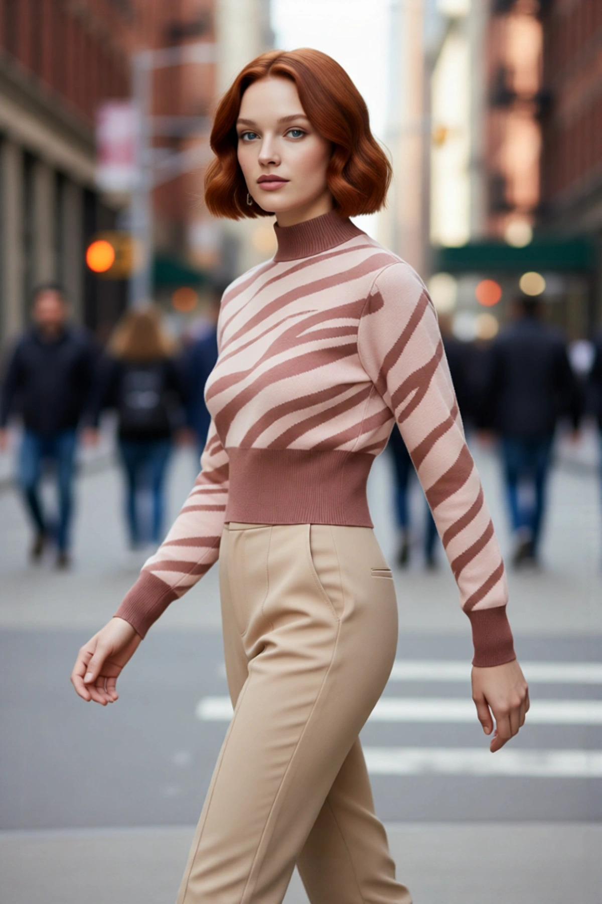 Kadınlara Özel Pembe Zebra Desenli Dik Yaka Uzun Kollu Crop Triko Kazak Kış Şıklığı İçin Kaliteli