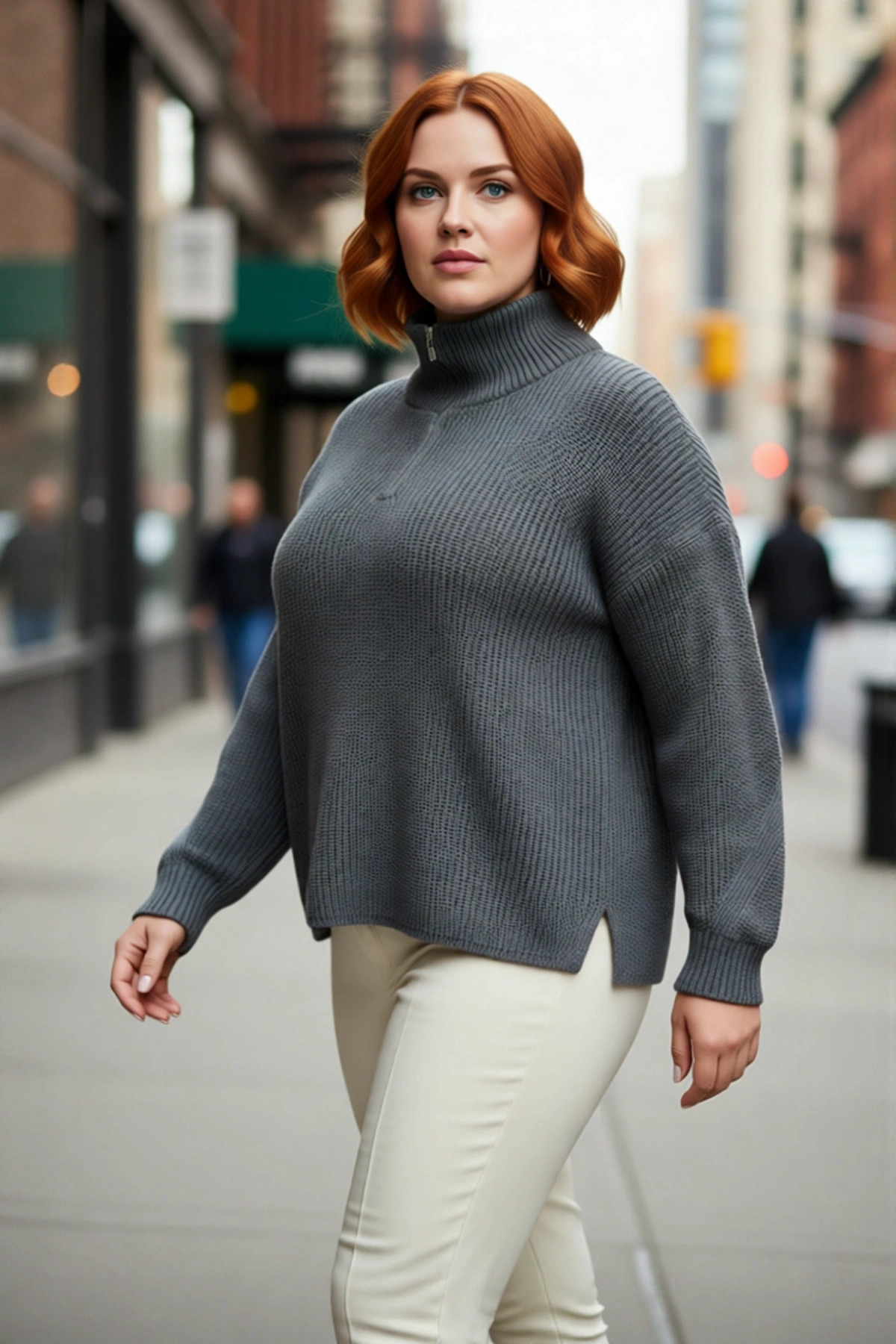 Kadın Kışlık Regular Kalıp Düz Desen Düşük Kol Fermuarlı Dik Yaka Akrilik Triko Kazak Kaliteli