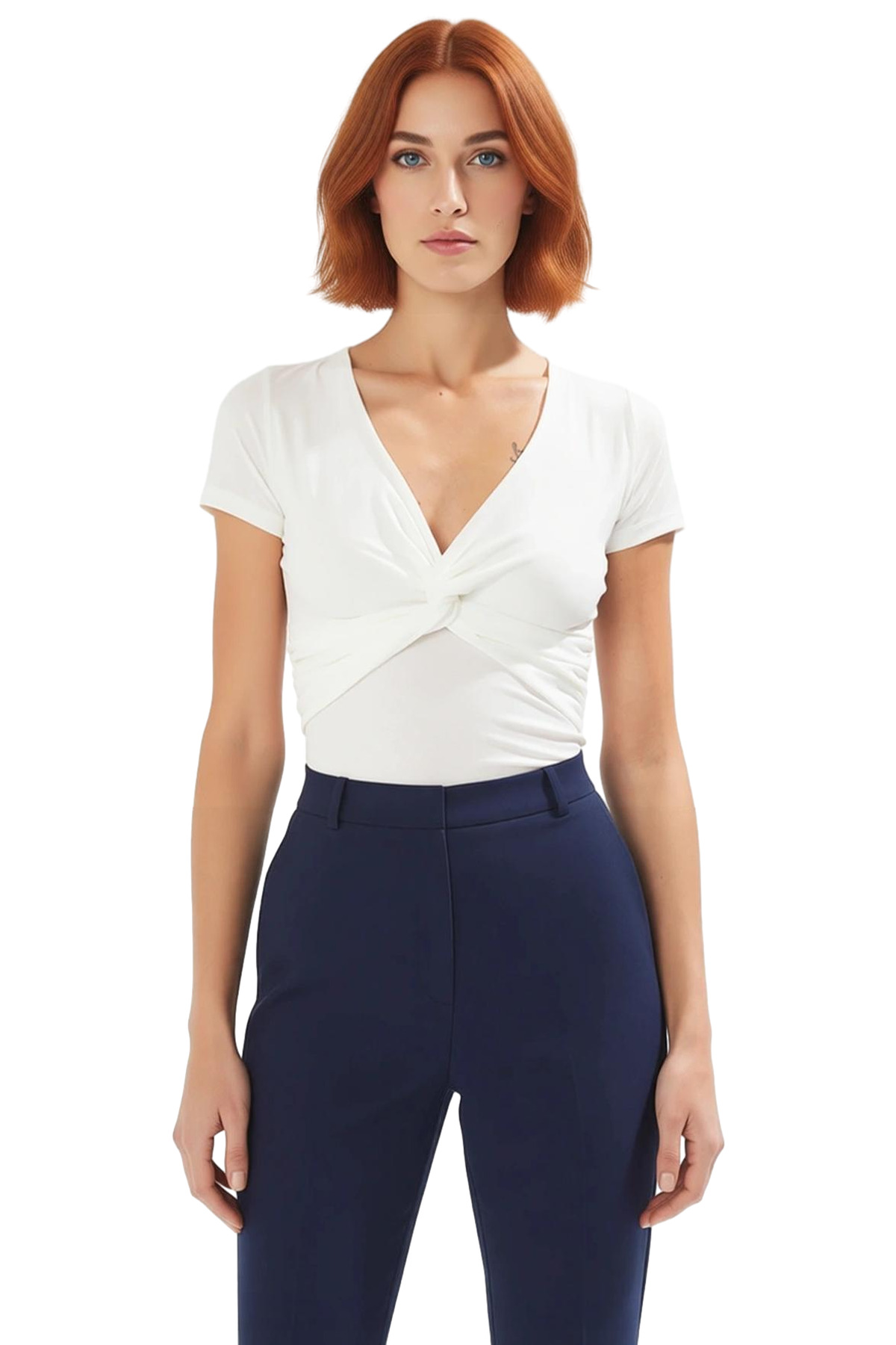 Yüksek kaliteli polyester kumaş, dayanıklılık ve uzun ömürlülük sağlar. Sandy dokuma tipi, kumaşın yumuşak ve pürüzsüz hissetmesini sağlarken, nefes alabilir yapısıyla sizi bunaltmaz. Bluzun V yaka tasarımı ve düğüm detayı, hem modern hem de şık bir görünüm sunar. Regular boyu, farklı vücut tiplerine uygunluğu ile dikkat çekerken, kısa kollu tasarımı sıcak yaz günlerinde idealdir. Her mevsim kombinlerinize uyum sağlayabileceğiniz bu bluzu, şort, etek, pantolon ve farklı tarzlarınızla kombinleyerek birçok farklı görünüm yaratabilirsiniz.