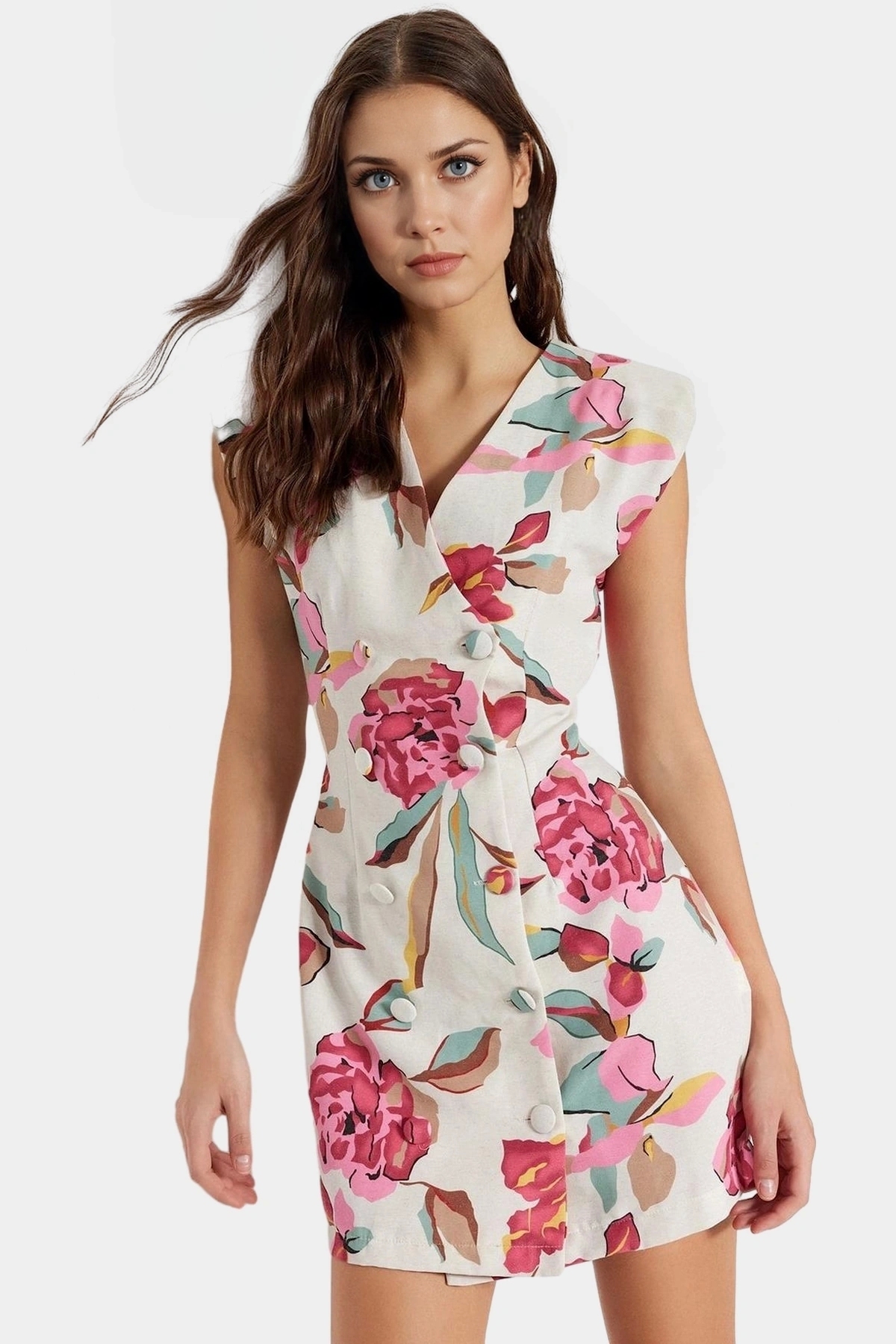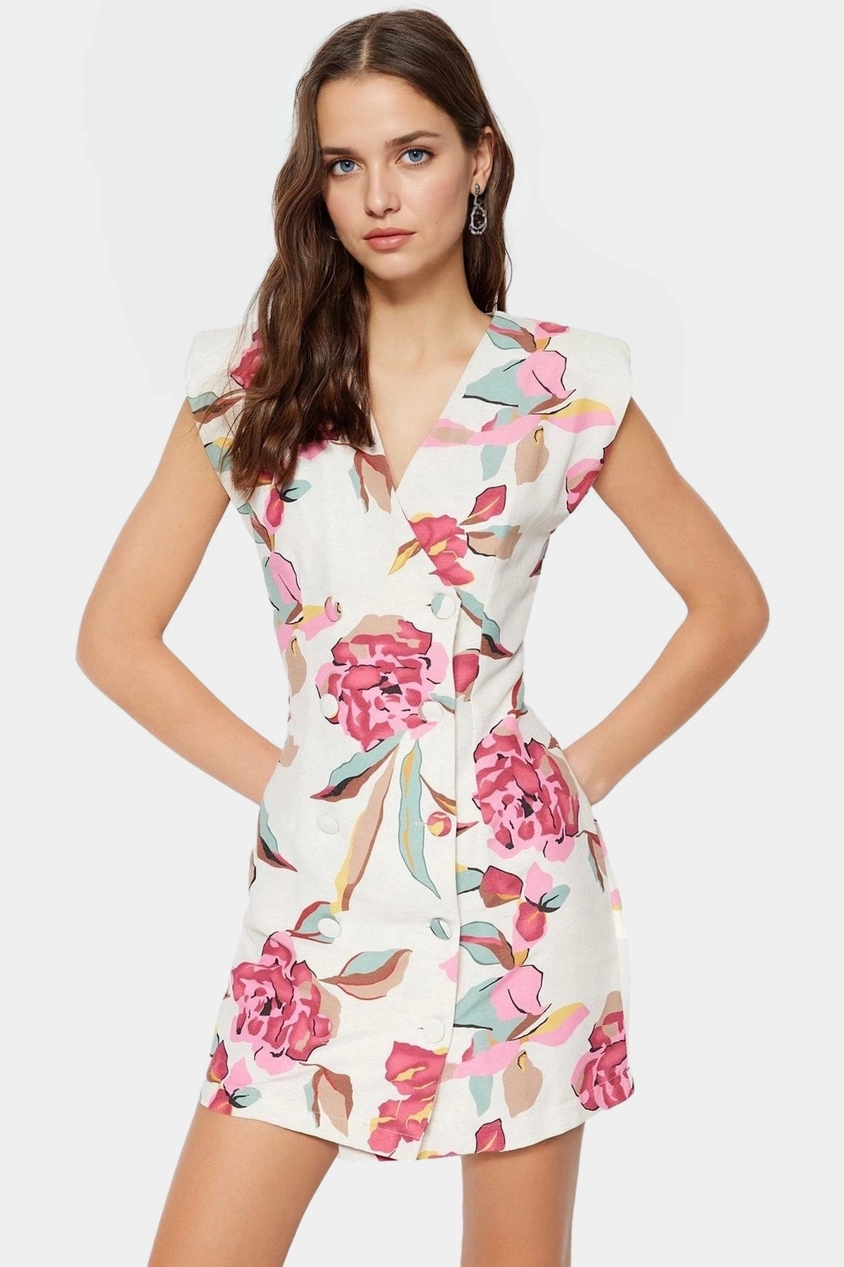 Bu kolsuz mini ceket elbise, günlük şıklığına önem veren kadınlar için ideal bir seçim. Keten görünümlü dokuma kumaştan üretilen elbise, 88 cm’lik ön boyuyla modern ve şık bir görünüm sunuyor. V yakası ve düğmeli tasarımıyla zarif bir hava katan elbise, rahat kalıbıyla hareket özgürlüğü sağlıyor. Çiçek deseninin canlı renkleri, elbiseye enerjik bir görünüm kazandırırken, şık ve rahat bir tarz yaratmanıza yardımcı oluyor.