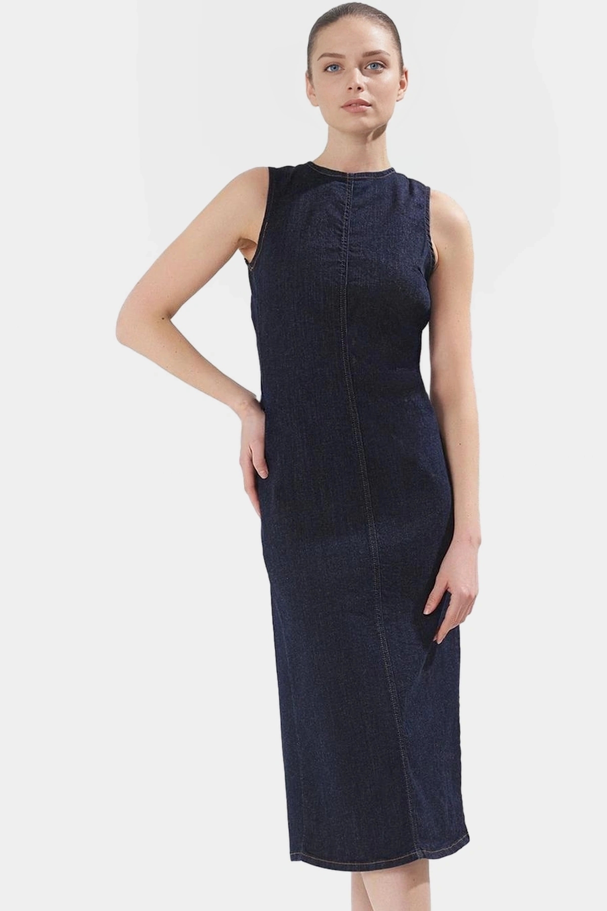 98 Pamuk Denim Midi Elbise Sırt Dekolteli Rahat Kalıp Günlük Kullanım - Görsel 3