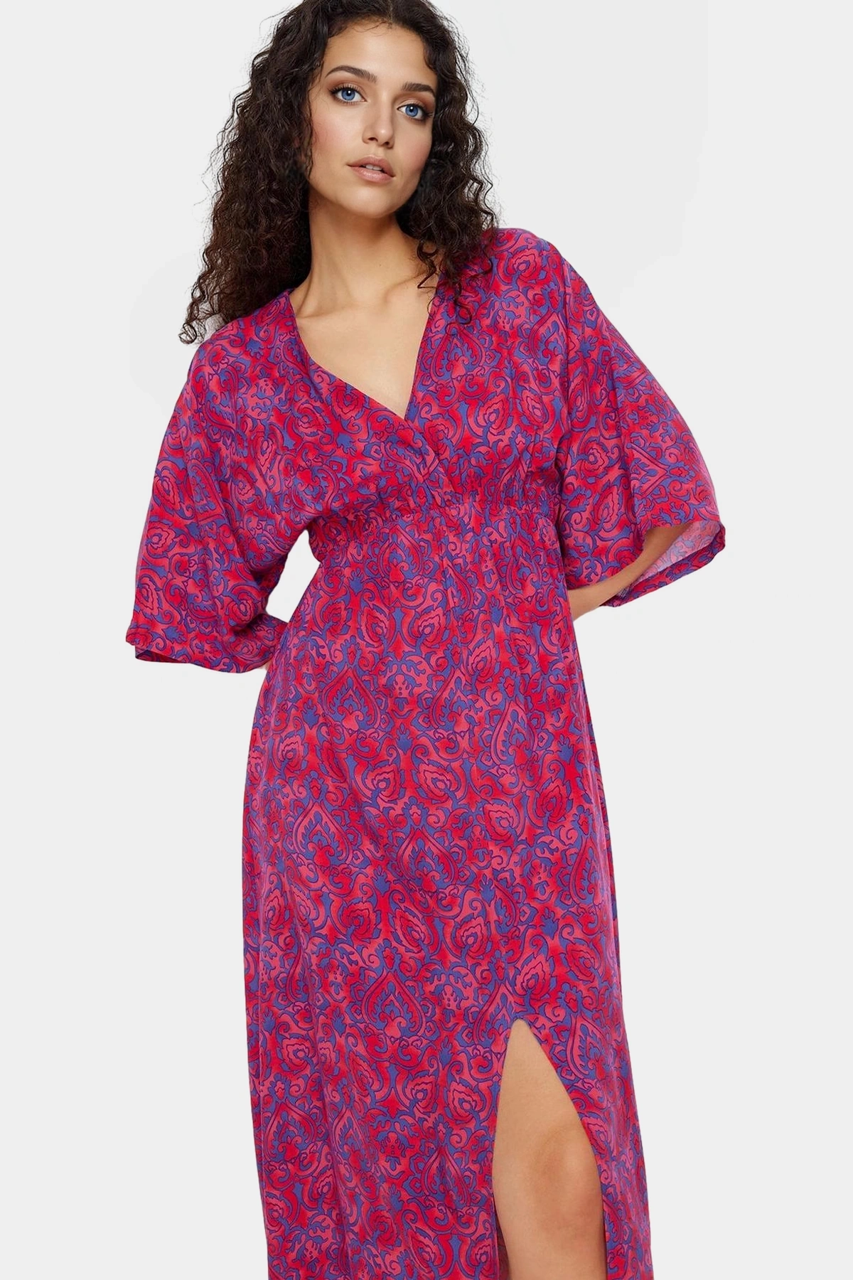 Şıklığı ve rahatlığı bir araya getiren bu midi elbise, yaz günlerinizin vazgeçilmezi olacak! Etnik desenleri ve A kesim modeliyle dikkat çeken elbise, yüksek kaliteli viskoz kumaştan üretilmiştir. Nefes alabilir yapısıyla gün boyu konfor sunarken, truva kar kollu tasarımıyla da modern bir tarz ortaya koyar.