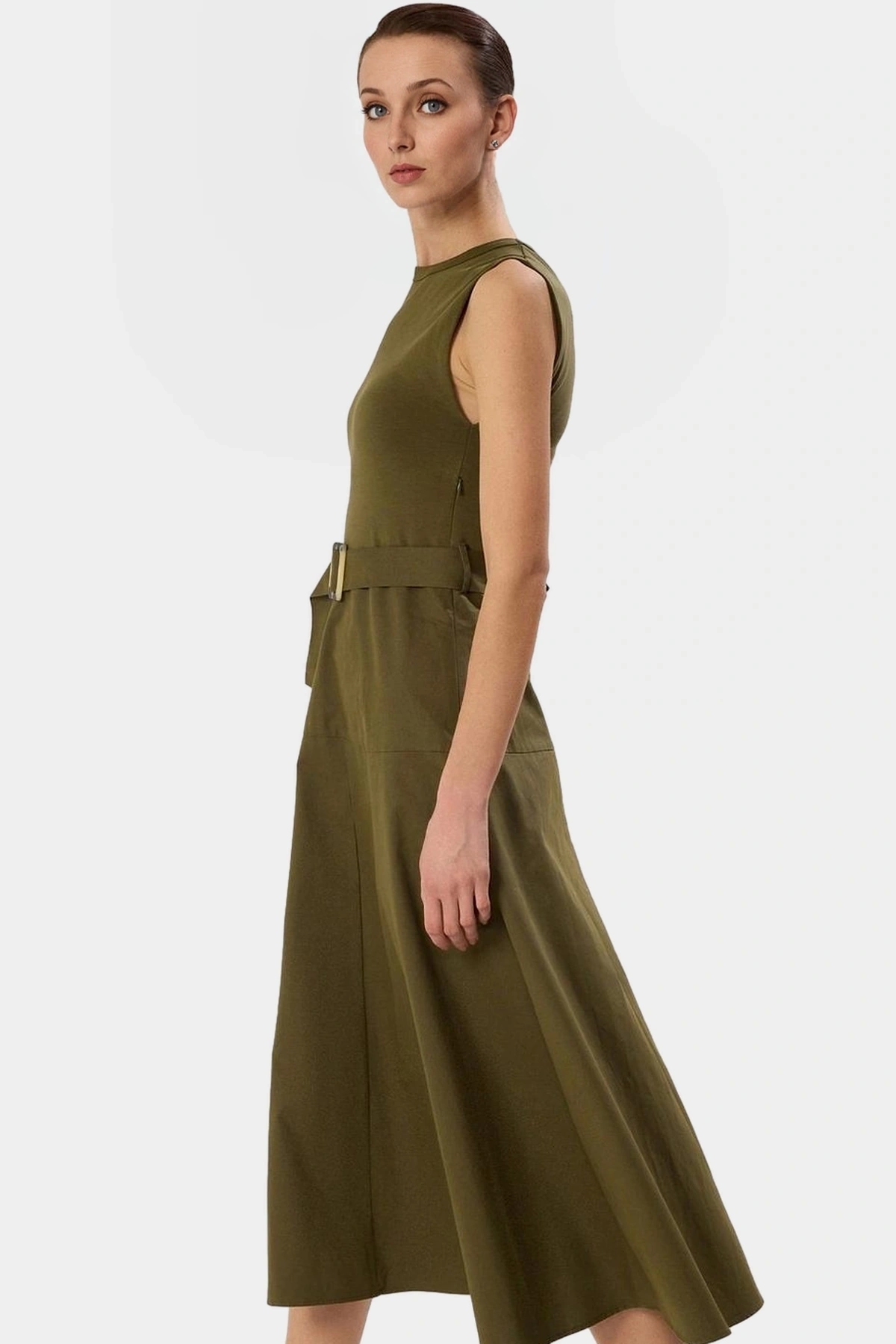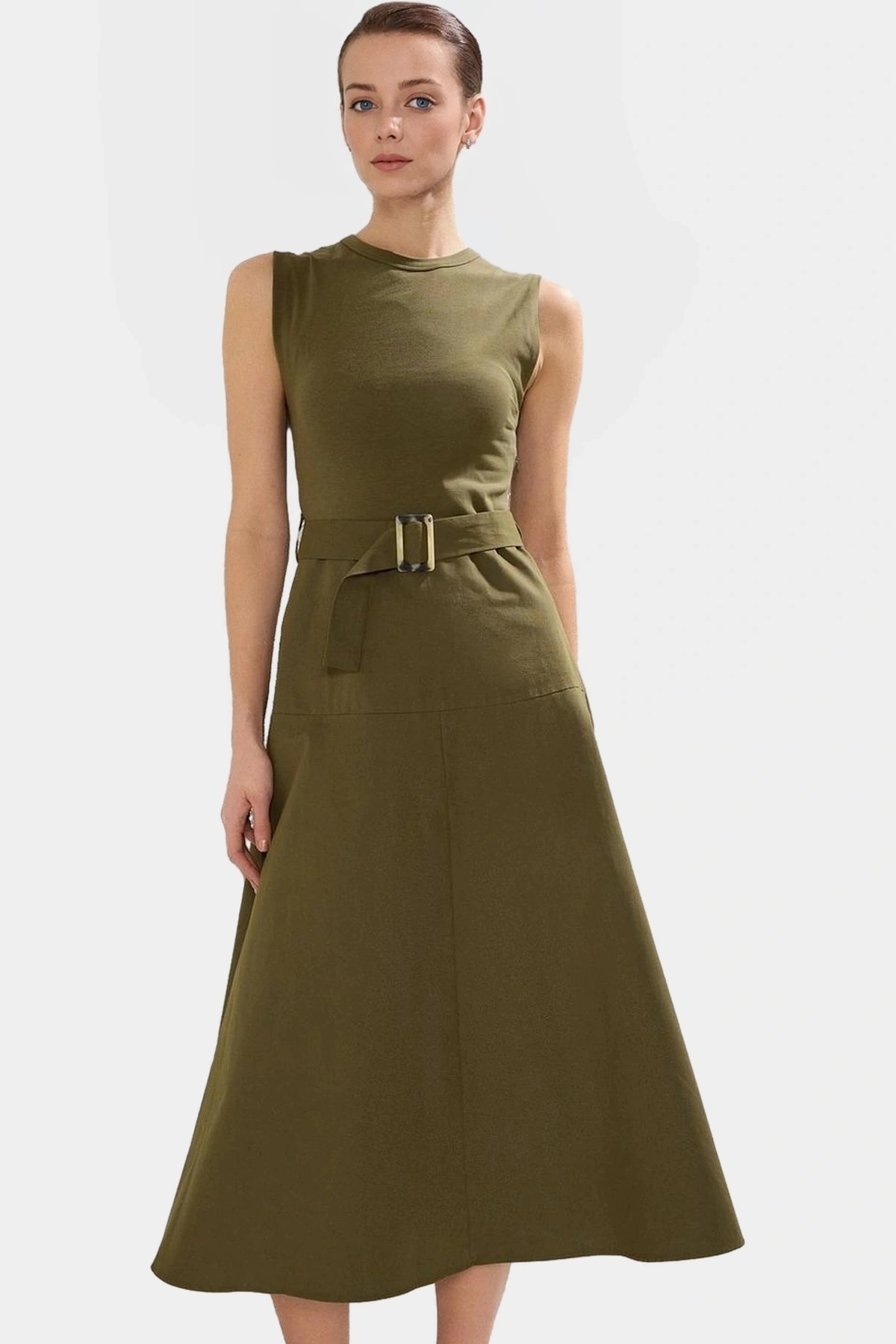 Rahatlığı ve şıklığı bir arada arayanlar için mükemmel bir seçenek olan bu midi elbise, %100 pamuk gabardin kumaşından üretilmiştir. Nefes alan yapısıyla yazın sıcak günlerinde bile serin kalmanızı sağlar. A kesim modeli, vücut hatlarınızı zarifçe sararken, kemer detayı belinizi ince göstererek silüetinize feminen bir dokunuş katar. Bisiklet yakası ve kolsuz tasarımıyla modern ve şık bir görünüm sunar. Günlük kullanıma uygun, aynı zamanda özel günlerinizde de rahatlıkla tercih edebileceğiniz, çok yönlü bir parçadır.