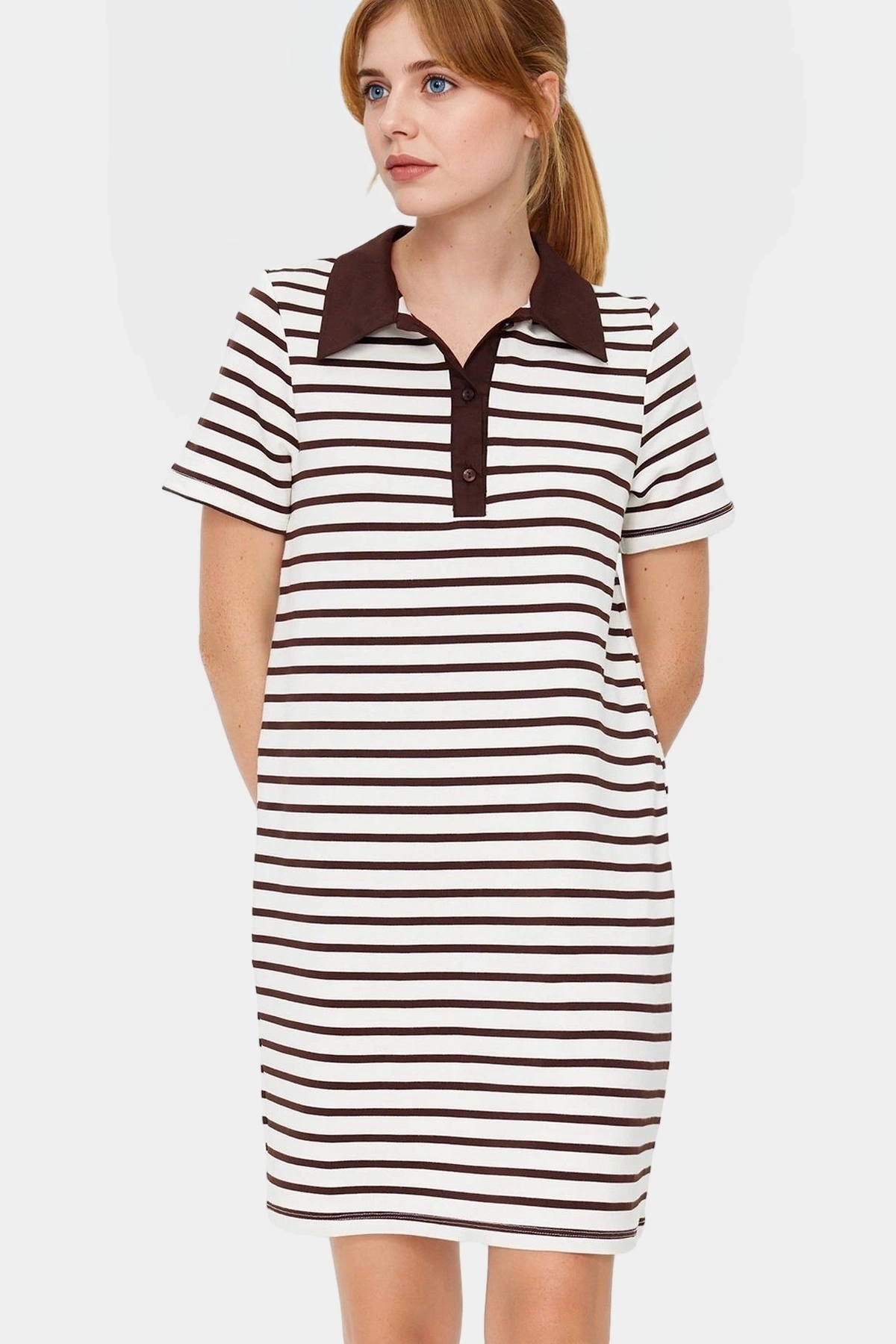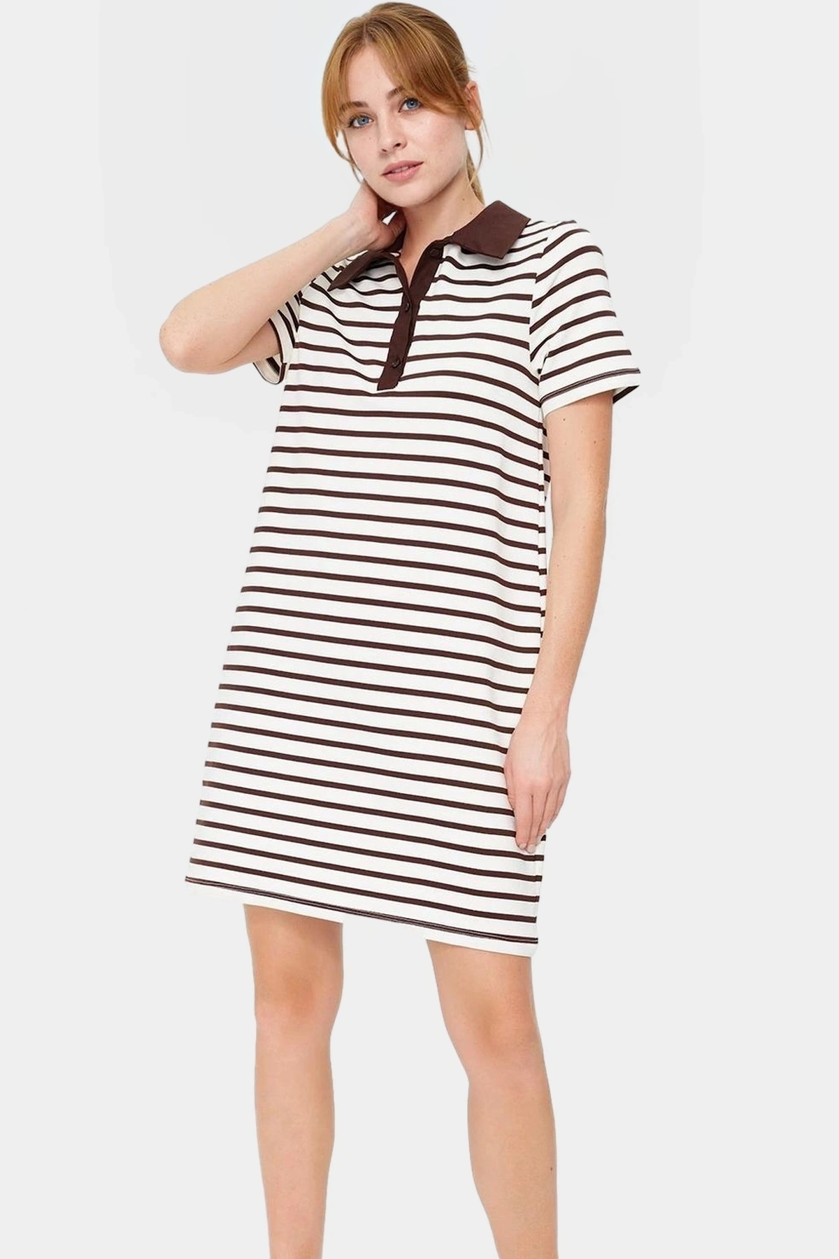 A Kesim Örme Elbise Viskoz Polo Yaka Çizgili Desen Modern Stil Kaliteli İşçilik Zarifane Tasarım