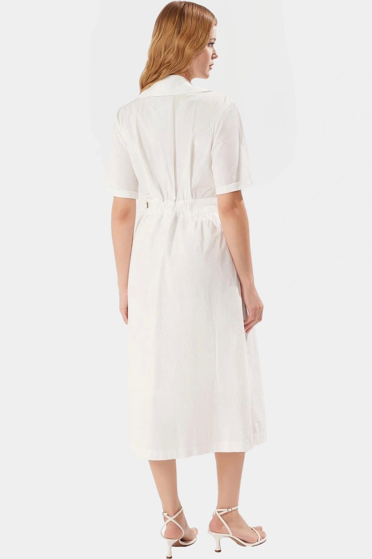 Günlük yaşamda rahatlığı ve şıklığı bir arada arayanlar için ideal bir seçim olan bu midi elbise, %100 pamuklu poplin kumaştan üretilmiştir. Nefes alan yapısıyla yaz sıcağında bile konforlu bir kullanım sunar. A-kesim kalıbı, her vücut tipine mükemmel uyum sağlarken, pili detaylı eteği hareket özgürlüğü sağlar. Kısa ve standart kolları ile pratik bir kullanım sunan elbise, gömlek yakasıyla şık ve modern bir görünüm kazandırır. Beldeki ince deri kemer detayı ise şıklığınıza ince bir dokunuş katar.