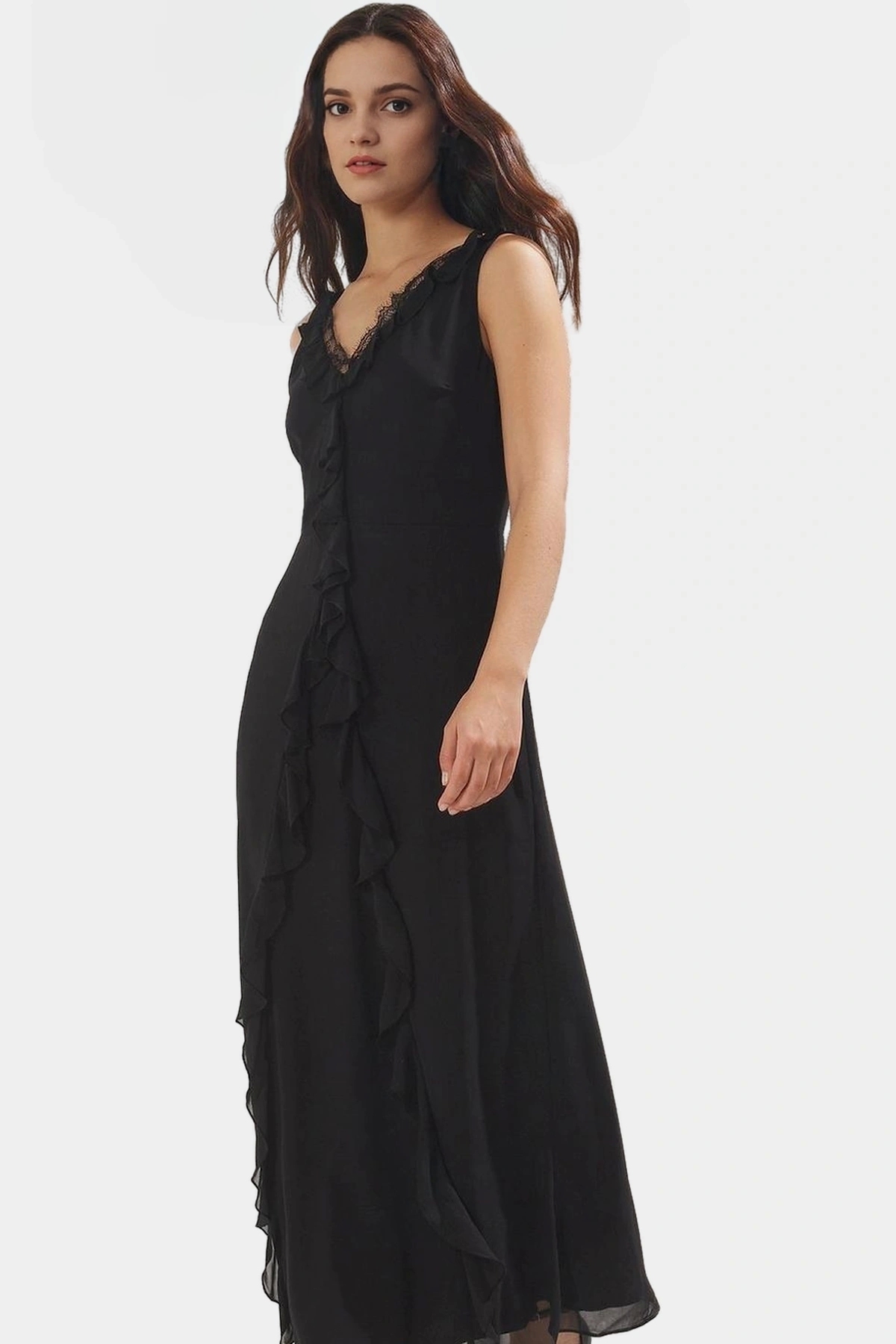 Bu muhteşem A-line kesim maxi elbiseyle, şıklığınızla büyüleyeceksiniz! Siyah rengi ve zarif fırfırlı detaylarıyla göz kamaştırıcı bir görünüm sunuyor. Nefes alan şifon dokuma kumaş, gün boyu rahatlık ve konfor sağlıyor. Kolsuz tasarımı sayesinde yaz aylarında serin kalırken, 135 cm boyuyla da uzun ve ince bir görünüm elde ediyorsunuz. Modelin Ölçüleri: Boy: 174 cm, Göğüs: 81 cm, Bel: 60 cm, Kalça: 87 cm. Manken S-36 beden giymektedir.