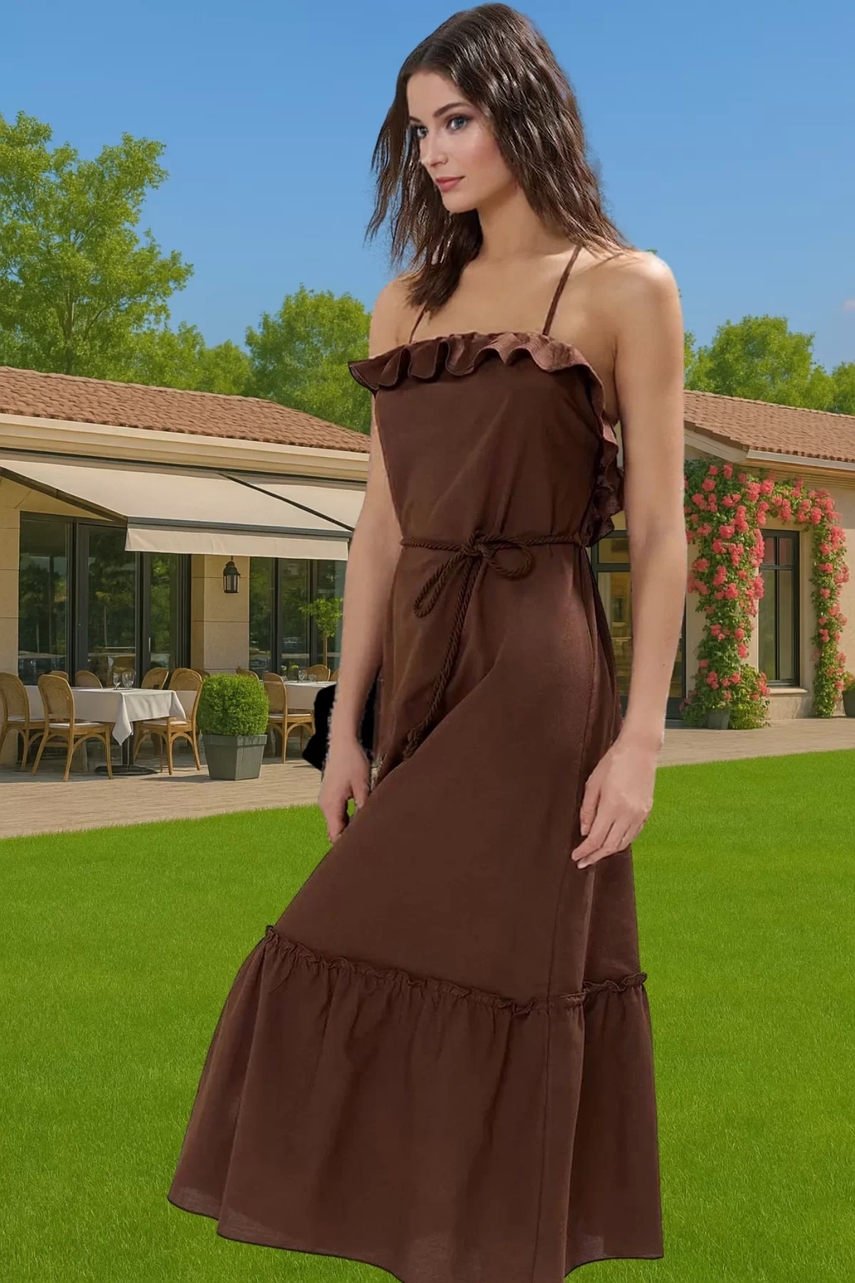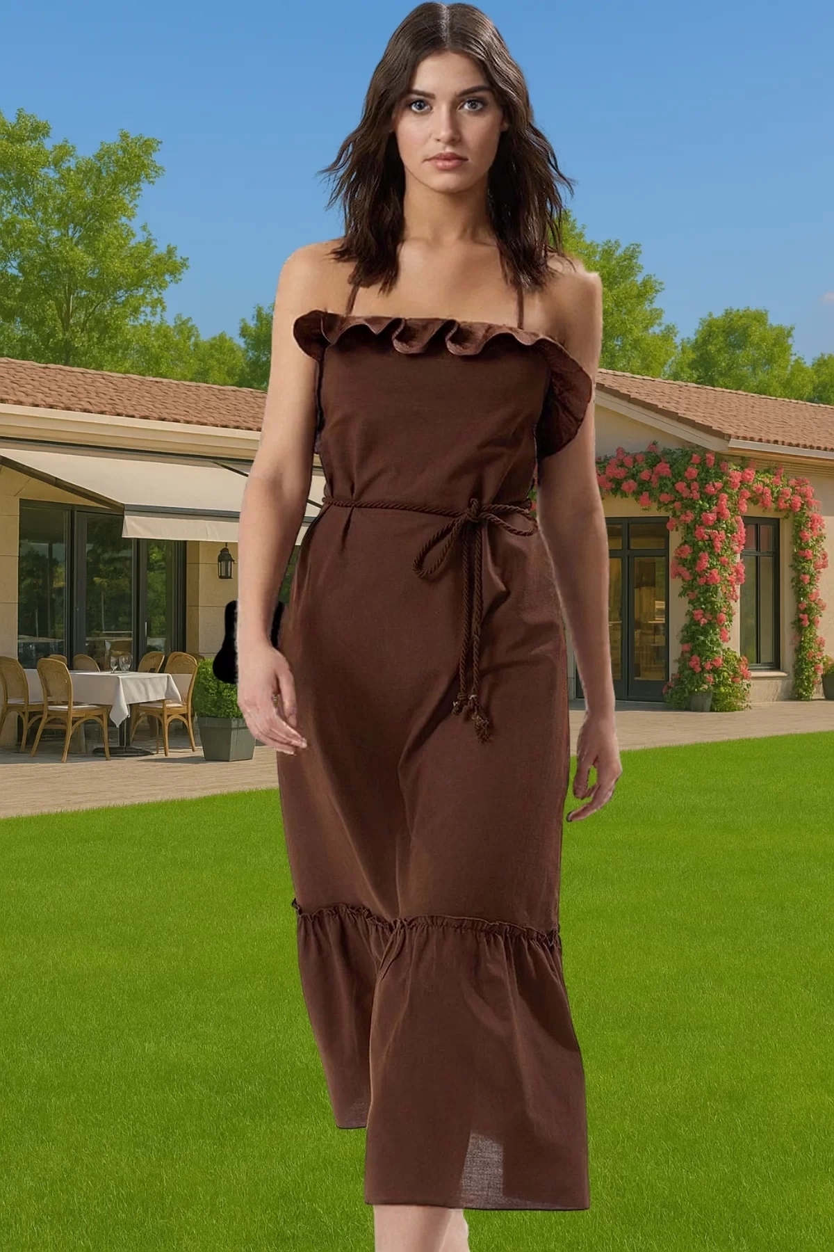 Bu yaz, plaj şıklığını ve günlük rahatlığı bir arada sunan muhteşem bir elbiseyle tanışın! %100 pamuktan üretilen bu A-line maxi elbise, hafif ve nefes alabilen kumaşıyla gün boyu konforu garanti eder. Kare yaka detayı ve volanlı detaylarıyla feminen ve şık bir görünüm sunar. Hem plajda güneşlenirken hem de şehirde gezilerinizde rahatlıkla kullanabileceğiniz bu çok yönlü elbise, gardırobunuzun yeni gözdesi olacak.