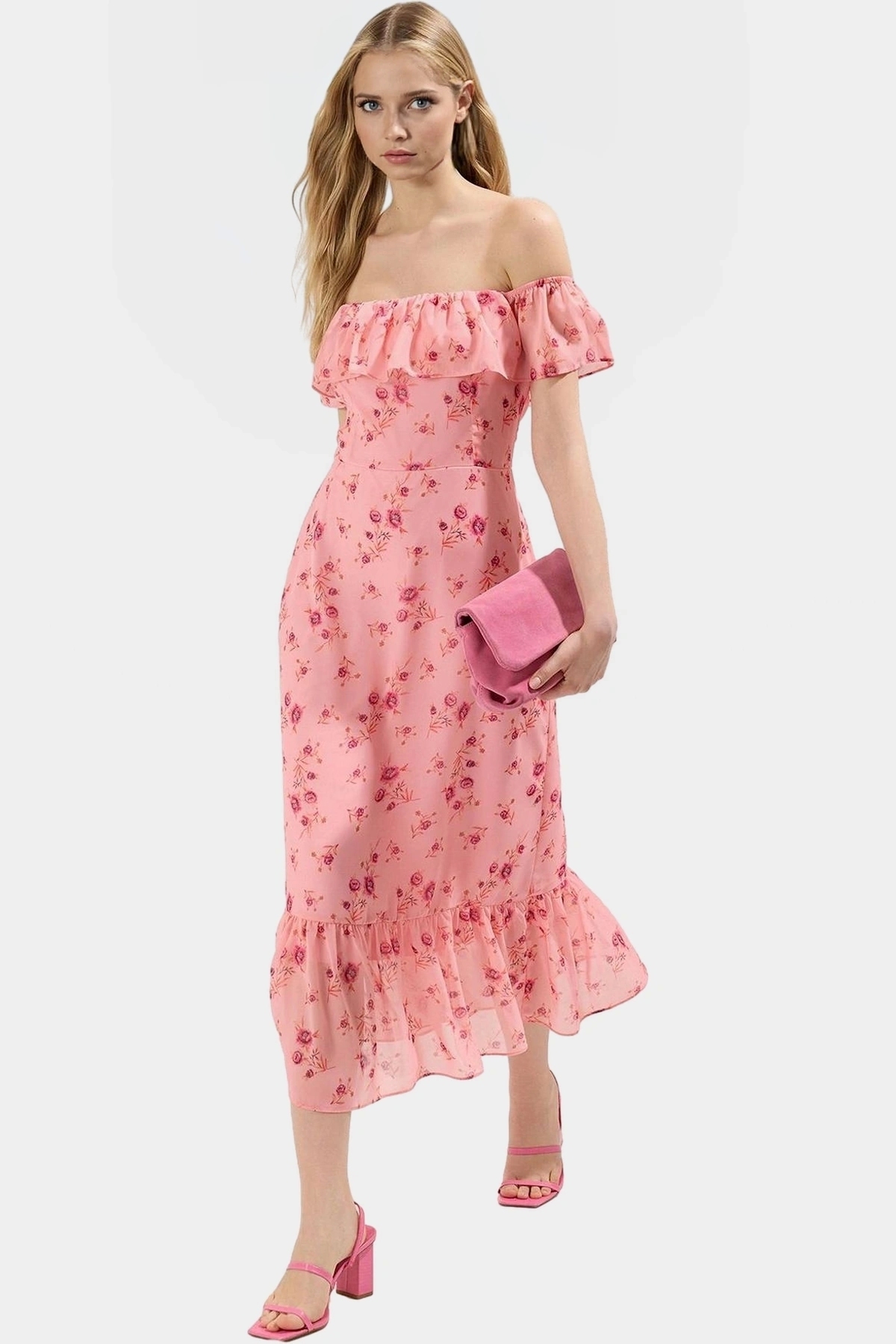 A line Şifon Midi Elbise Kısa Kollu Çiçekli Desen Carmen Yaka Rahat Ve Şık Zarifane Tasarım