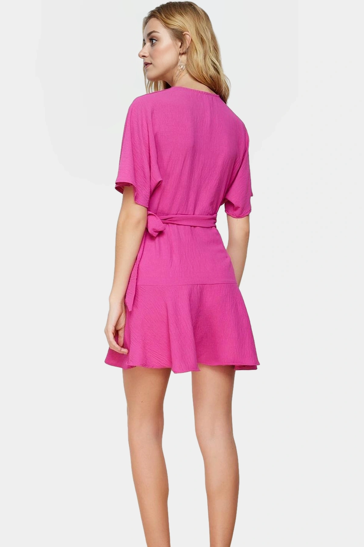 Bu çarpıcı pembe elbise, yaz günlerinde hem şık hem de rahat olmak isteyenler için mükemmel bir seçim. 100% polyester aerobin dokuma kumaştan üretilen elbise, nefes alabilir yapısıyla gün boyu konfor sunar. Kruvaze kesim ve V yaka detayı ile feminen bir görünüm kazandıran elbise, kısa kolları ve mini boyu ile sıcak havalarda serin kalmanıza yardımcı olur. Fırfırlı detayları ise elbiseye hareketli ve eğlenceli bir hava katıyor.