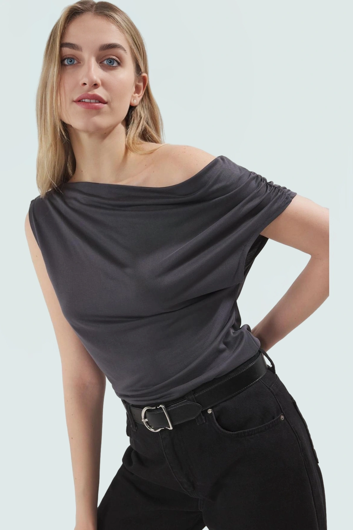 Günlük yaşamınızda şıklığı ve rahatlığı bir arada sunan bu kolsuz bluzumuz, benzersiz tasarımı ve yüksek kaliteli kumaşıyla dikkat çekiyor. Akışkan modal kumaştan üretilen bluz, vücudunuza mükemmel uyum sağlar ve gün boyu konfor sunar. Fitted kalıbı ile vücut hatlarınızı zarifçe ortaya koyarken, asimetrik yakası da modern ve stil sahibi bir görünüm yaratır. Gri rengi, her türlü kombinasyonla uyumlu olup, gardırobunuzun çok yönlü bir parçası haline gelecektir.