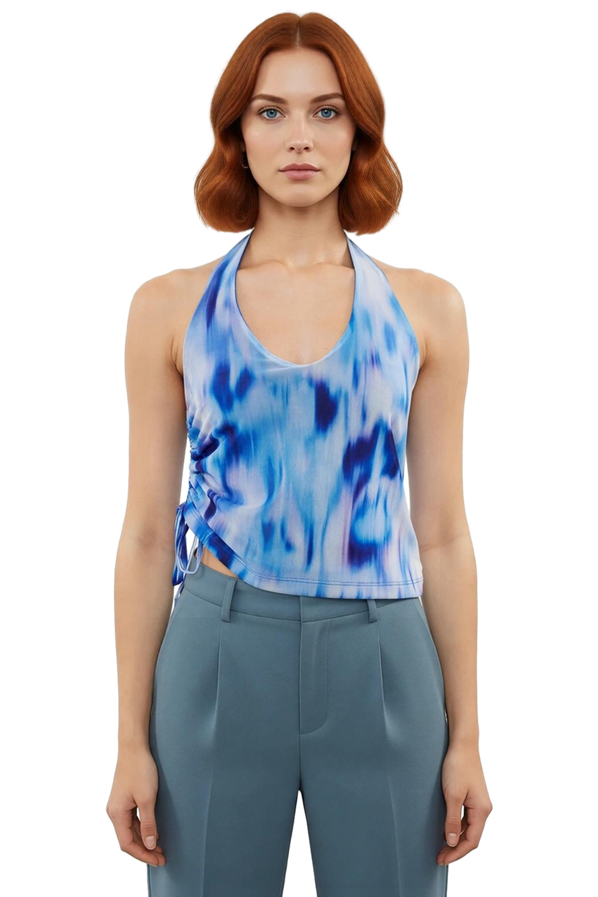Şıklığı ve konforu birleştiren bu asimetrik kesimli bluz, yaz aylarının vazgeçilmezi olacak. Mavi soyut desenleri, benzersiz tarzınızı yansıtırken, boyundan bağlamalı tasarımıyla feminen bir hava katıyor. Yüksek kaliteli, %95 Polyester ve %5 Elastan karışımı örme kumaşıyla hem şık hem de rahat bir deneyim sunuyor. İnce ve nefes alan tül dokusu, sıcak havalarda serin kalmanıza yardımcı olur. Büzgü ve drape detayları, bluza hareketlilik ve derinlik kazandırıyor.
