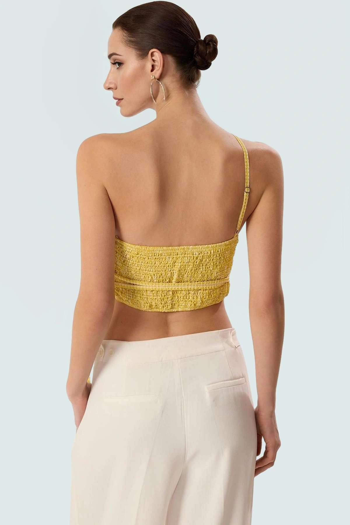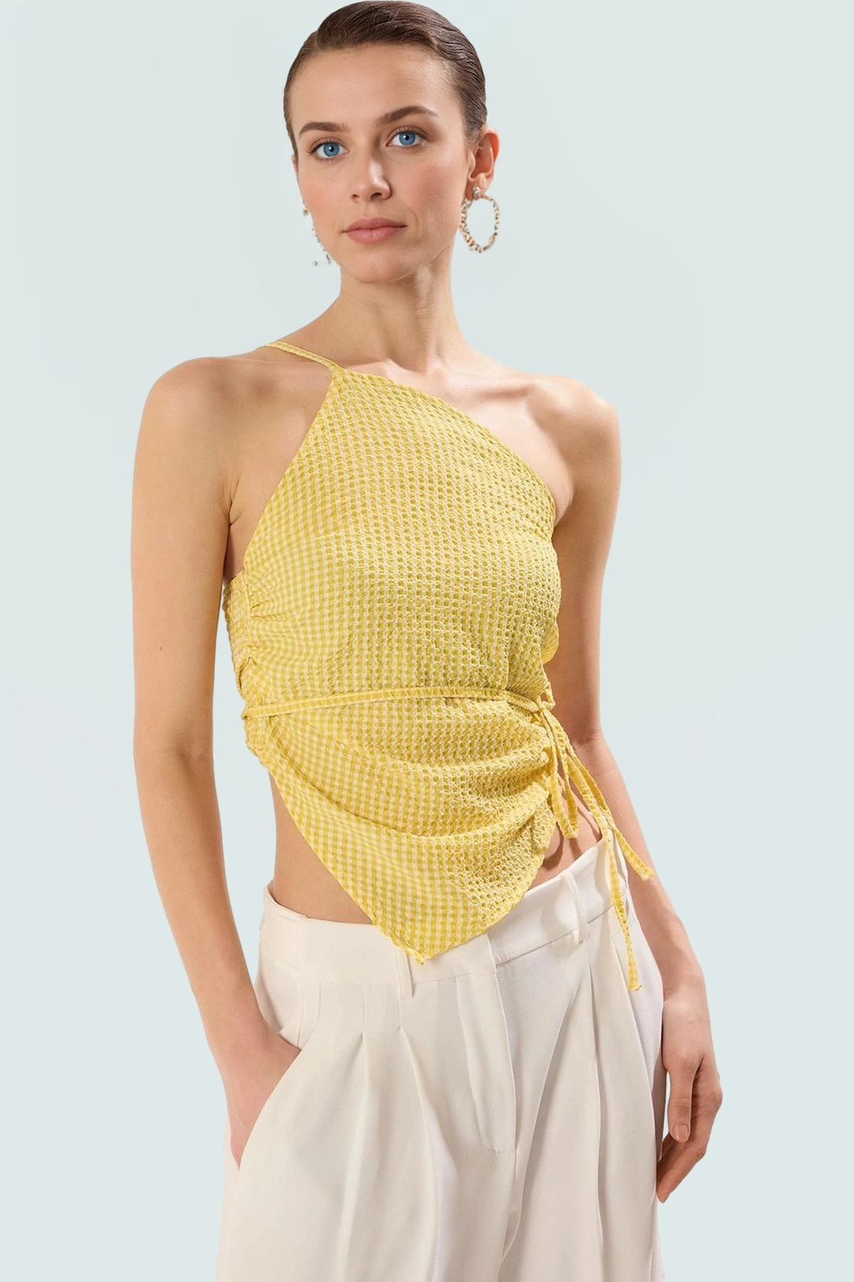 Göz alıcı sarı rengi ve şık çizgileriyle dikkat çeken bu bluz, yaz aylarının stil sahibi parçası olacak. Asimetrik yakası ve ince askılarıyla feminen bir görünüm sunarken, fitted kalıbıyla vücut hatlarınızı vurgulamak için tasarlandı. Yüksek kaliteli dokuma kumaştan üretilen bluz, nefes alabilirliği ve konforuyla gün boyu rahatlık sağlar. %69 polyester, %29 pamuk ve %2 elastan karışımı, dayanıklılığı ve yumuşak dokusuyla fark yaratıyor.