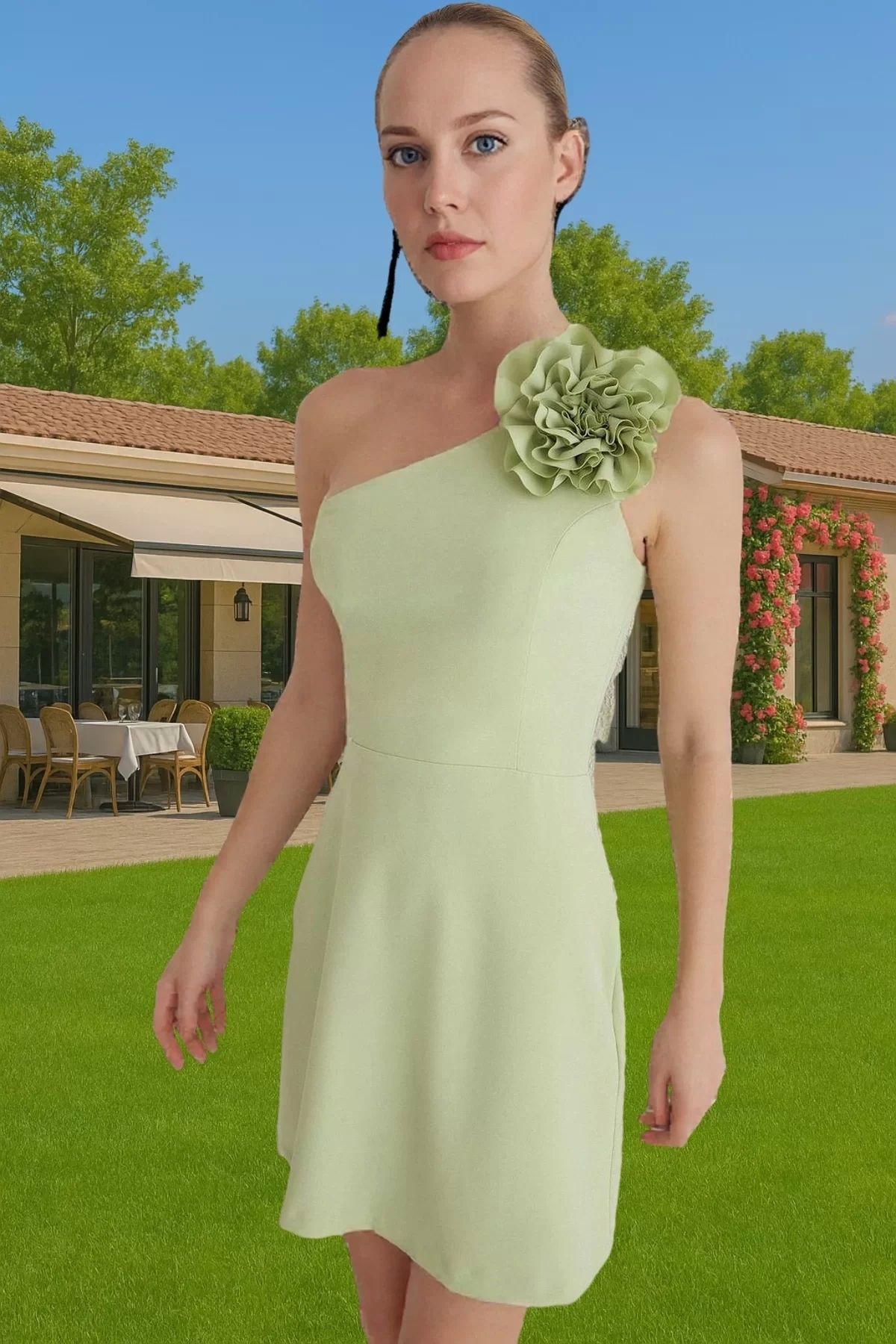 Asimetrik Yaka Mini Elbise Tek Omuzlu Gül Detaylı Yazlık Profesyonel Görünüm Profesyonel Görünüm - Görsel 4