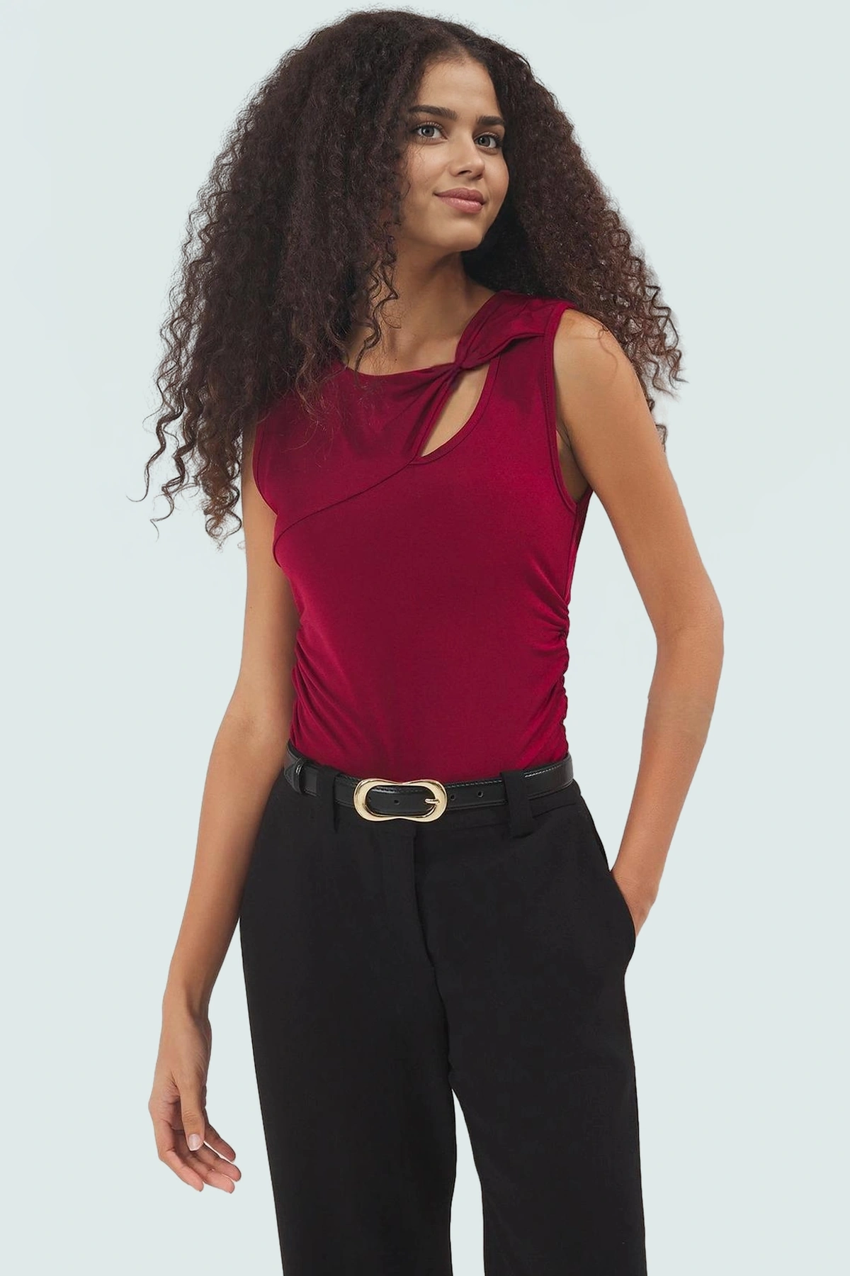 Vücuda mükemmel oturan, şıklığı ve rahatlığı birleştiren bu bordo bluz, gardırobunuzun vazgeçilmez parçalarından biri olacak. Asimetrik yakası ve zarif aksesuar detayıyla dikkat çeken bluz, hem günlük kombinlerinizde hem de özel davetlerinizde mükemmel bir seçim. Yüksek kaliteli örme kumaştan üretilen bluz, nefes alabilir yapısıyla yaz aylarında bile sizi serin tutacak. Esnek yapısı sayesinde gün boyu rahat hareket edebilirsiniz.