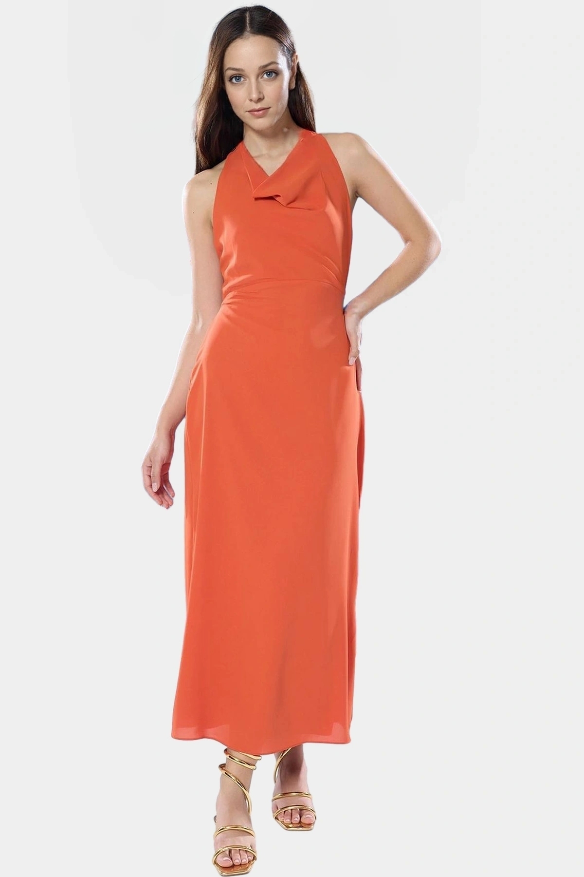 Elbisenin ön boyu 130 cm’dir. Modelin boyu 174 cm ve fotoğraftaki ürün S-36 bedendir. Modelin ölçüleri: Boy: 174cm GöğüS-81cm Bel: 60cm Kalça: 87cm. Günlük kullanımda düz sandaletler veya spor ayakkabılarla, akşam davetlerinde ise şık topuklularla ve zarif takılarla kombinleyebilirsiniz.