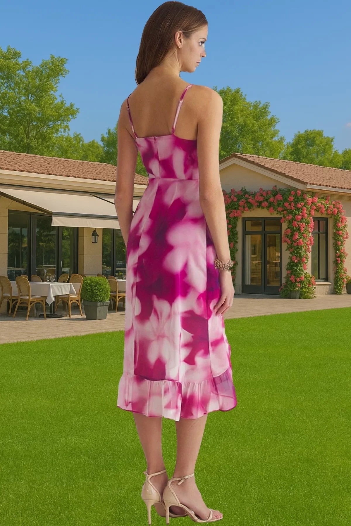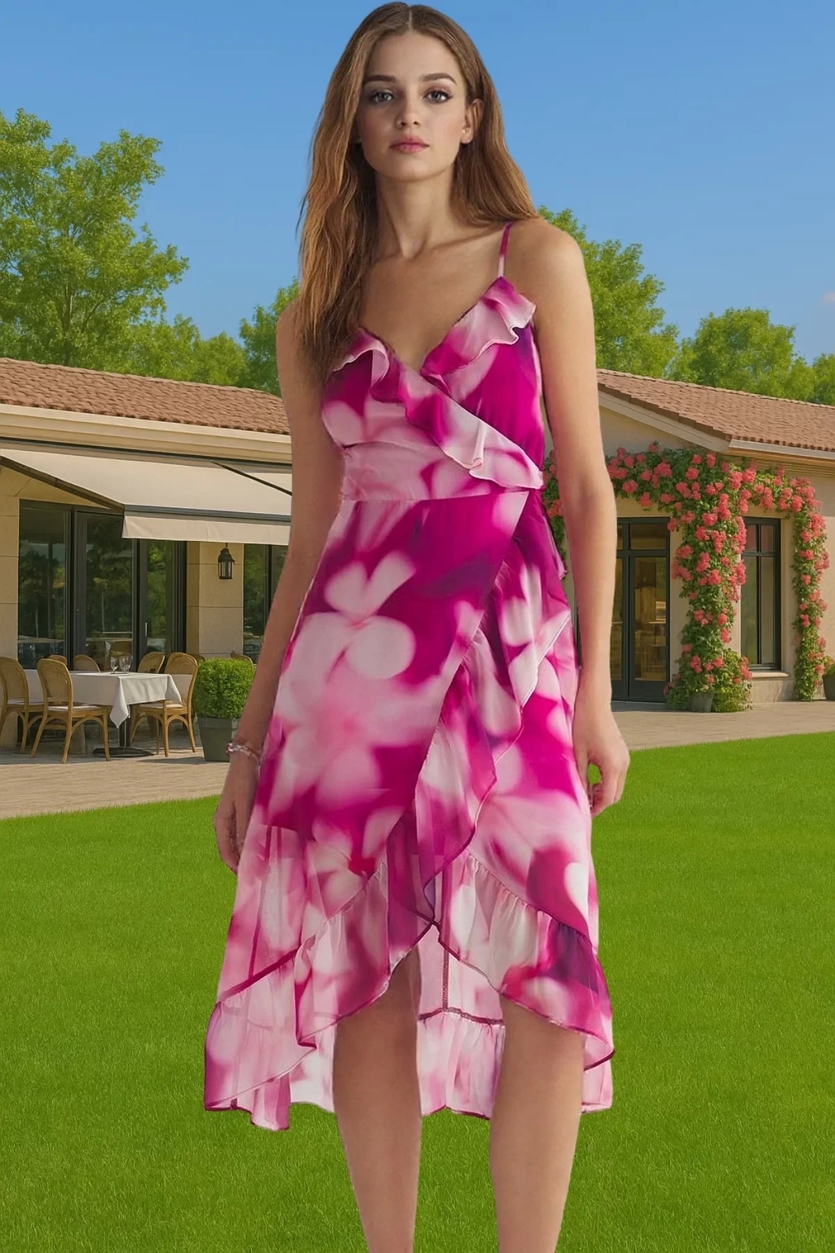 Astarlı Şifon Midi Elbise V Yaka Kruvaze Desenli Kaliteli İşçilik Özenle Seçilmiş Rahat Ve Şık