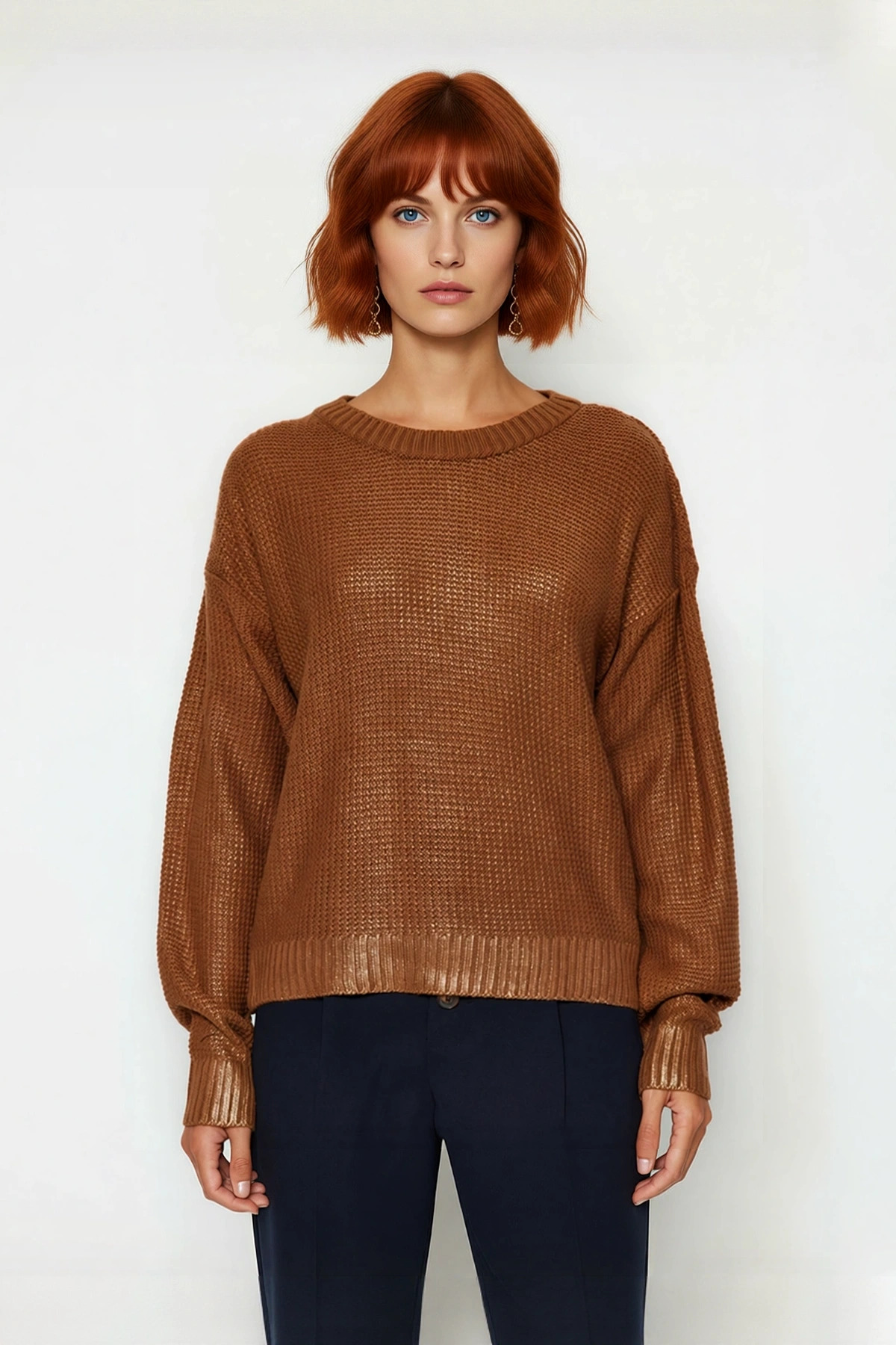 Ürün Özellikleri: Oversize kalıp, akrilik materyal, varak baskılı desen, bisiklet yaka, düşük kol, triko kumaş, kahverengi renk.