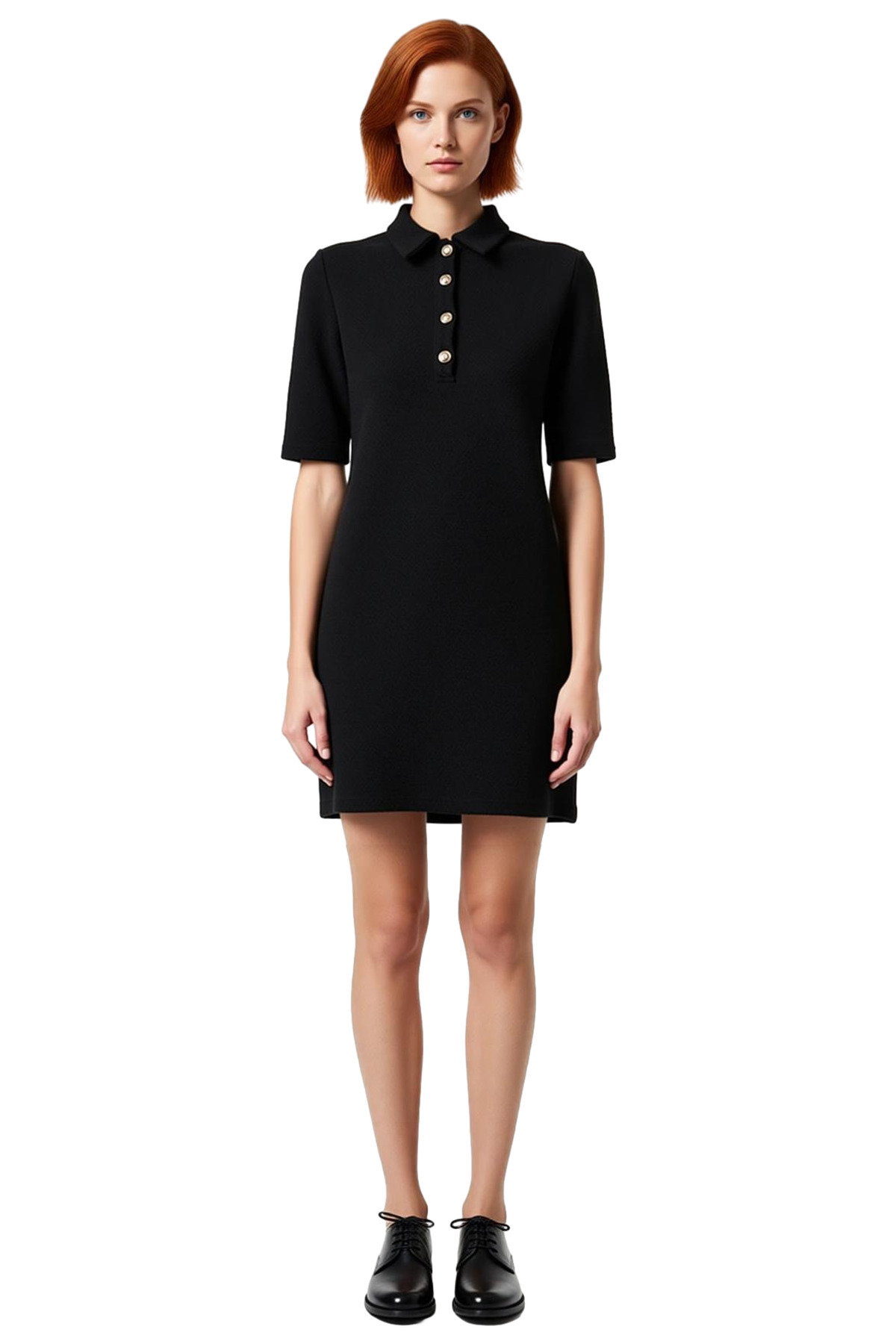 Ürün Özellikleri: Shift kalıp, polyester karışımlı materyal, düz desen, polo yaka, kısa kol, örme kumaş, siyah renk.