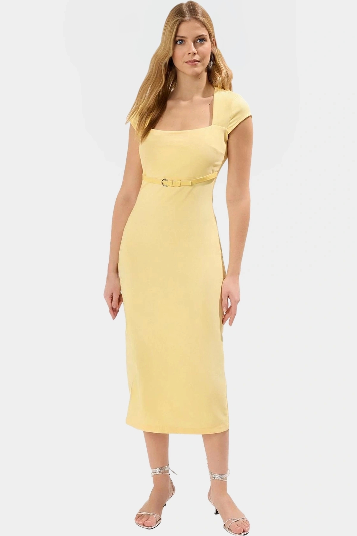 Bodycon Kesim Kısa Kollu Midi Elbise Dokuma Kemer Detaylı İş Elbisesi Rahat Kullanım Uzun Ömürlü