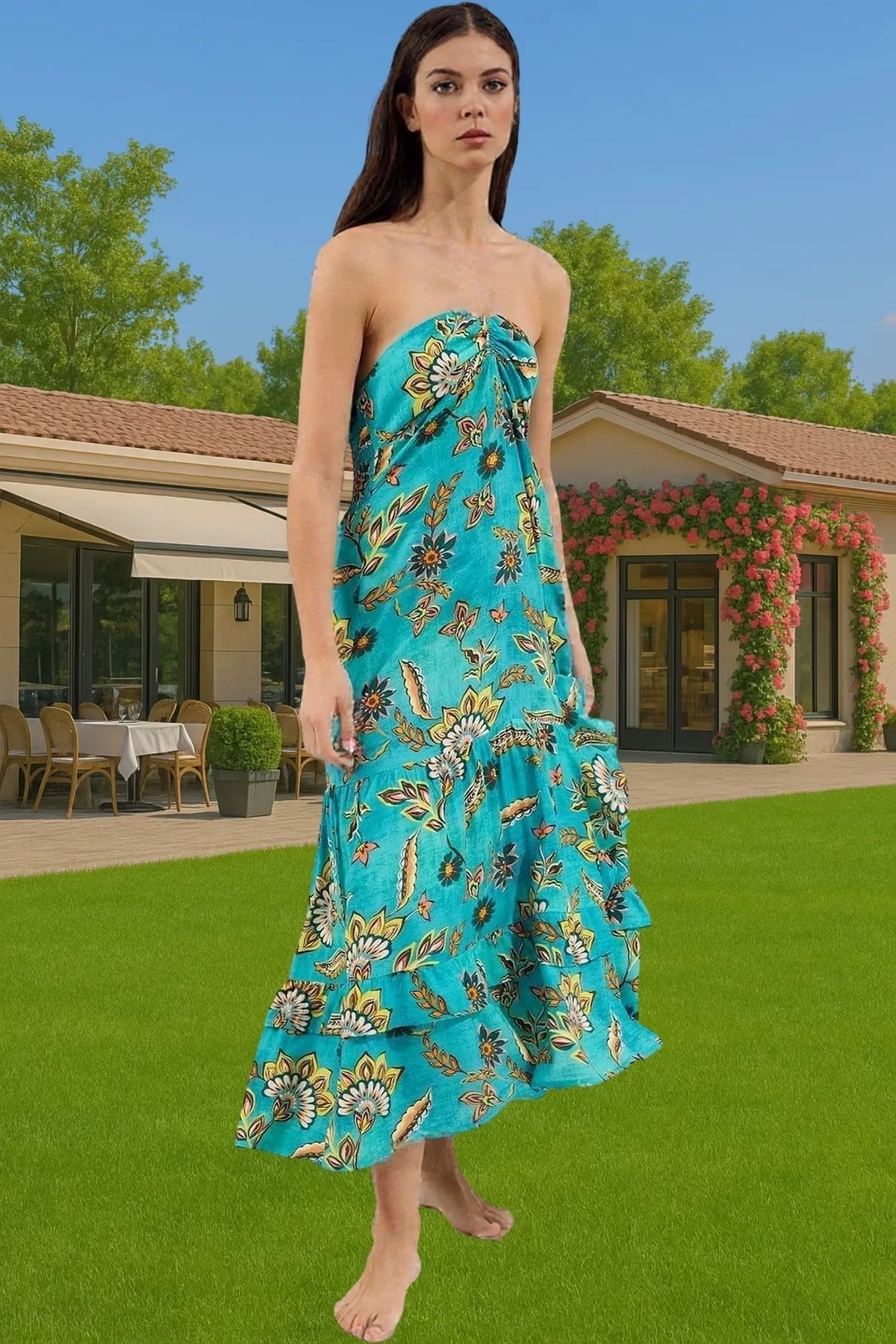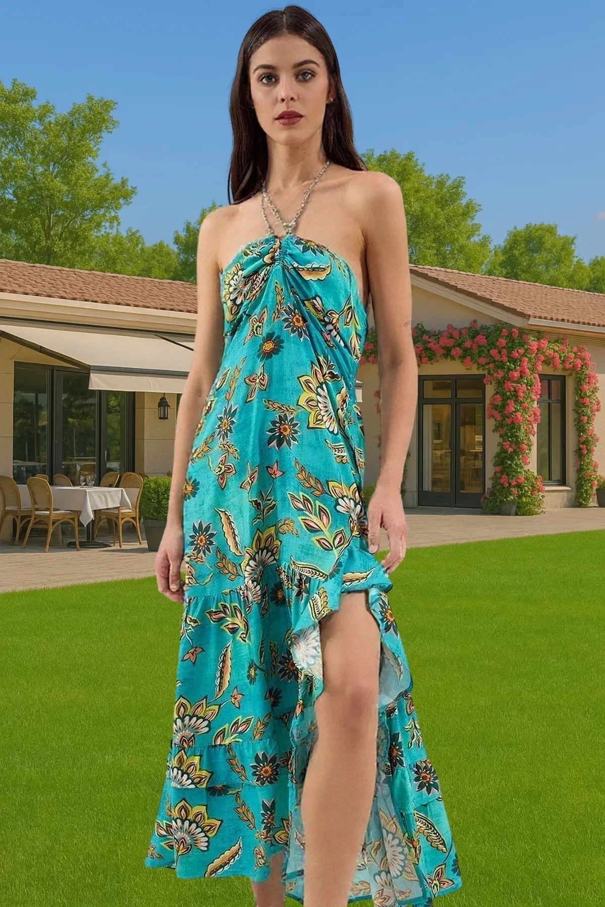 Yaz aylarının vazgeçilmezi olacak bu boyundan bağlamalı plaj elbisesi, rahatlığı ve şıklığı bir arada sunuyor. Nefes alan viskoz kumaştan üretilen elbise, gün boyu konforlu bir kullanım sağlar. Çiçek desenleri ve fırfır detaylarıyla feminen bir tarz yaratırken, skater kalıbı ile vücudunuza mükemmel uyum sağlar.