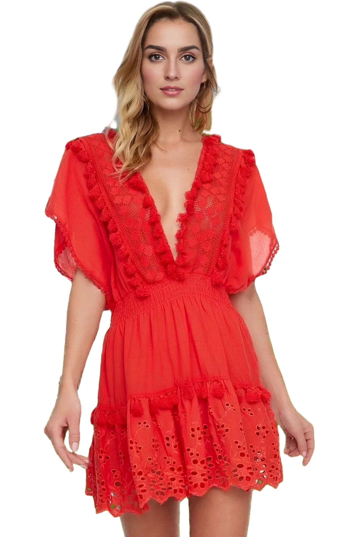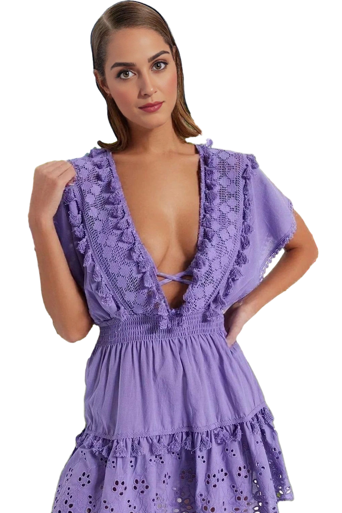 Yaz aylarının vazgeçilmez parçası olacak, brode detaylı ve V yakalı bu mini elbiseyle tanışın! %100 pamuk kumaşı sayesinde, gün boyu konforlu bir kullanım sunar. Nefes alabilir yapısıyla yaz sıcağında bile serin kalmanıza yardımcı olurken, şık ve feminen tasarımıyla her ortamda göz kamaştırıcı görünmenizi sağlar. V yaka detayı ve brode işlemeleri, elbisenize zarif bir hava katarken, düşük kol kesimi yaz sıcağında rahat hareket etmenizi sağlar. Mini boyu, modern ve şık bir siluet oluşturmanıza yardımcı olur.