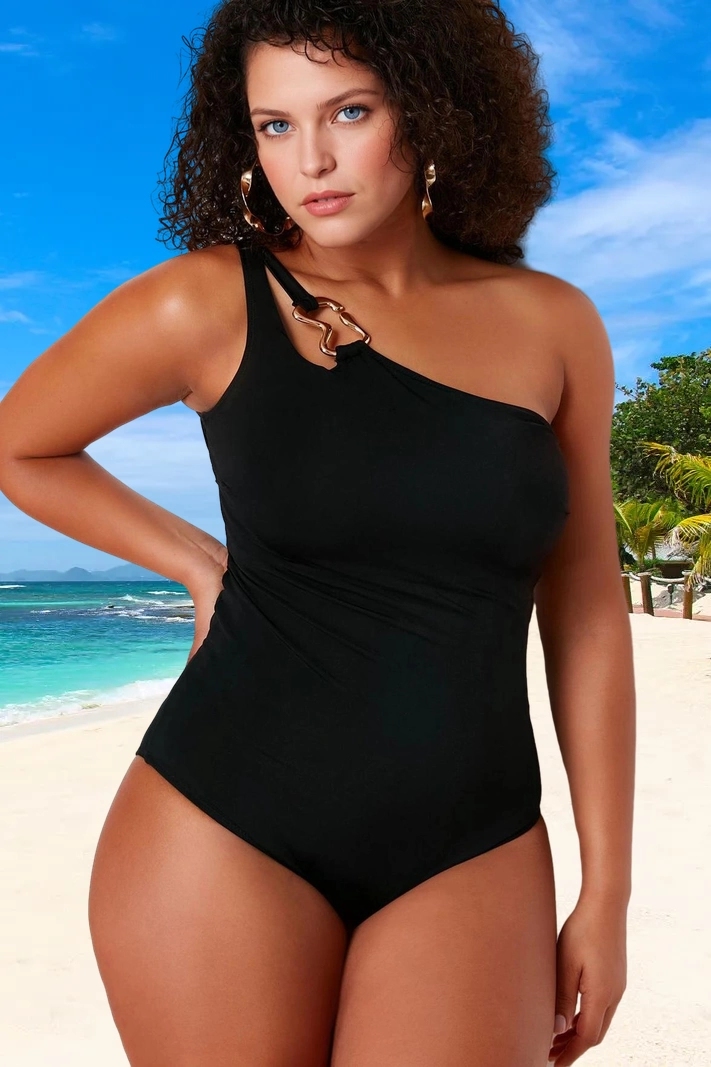 Büyük Beden Atma Kap Askılı Çapraz Bağlama Yaka Siyah Tek Omuz Mayo